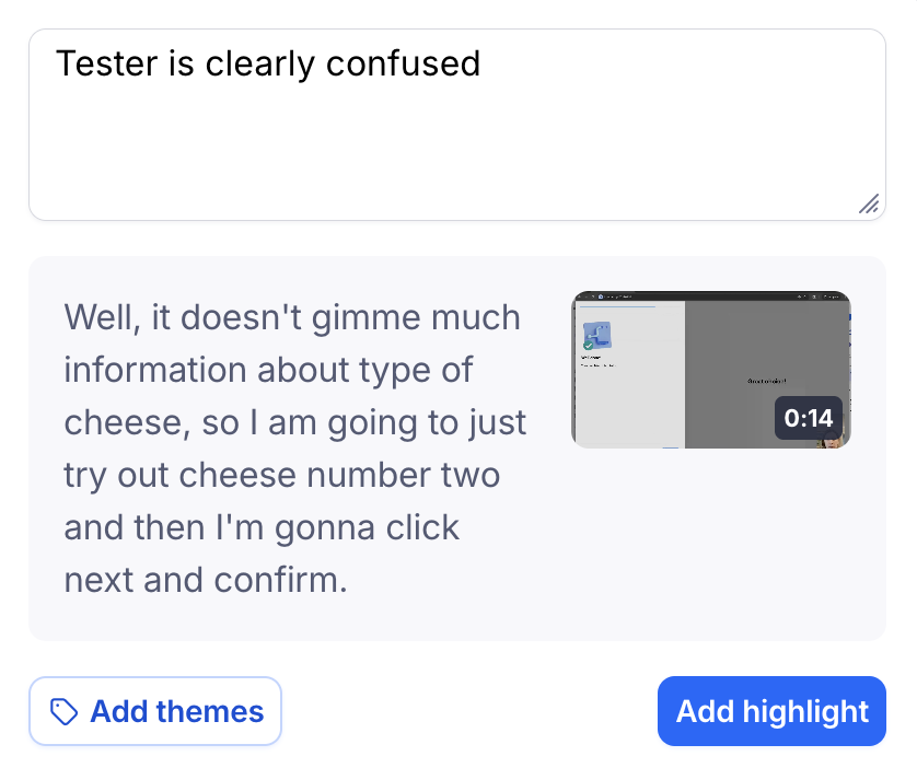 For unmoderated studies, Maze automatically generates highlights from clip transcripts when participant sessions are completed. Each AI-generated highlight includes a note summarizing the key observation from the clip, giving you a head start on analysis without any manual effort.