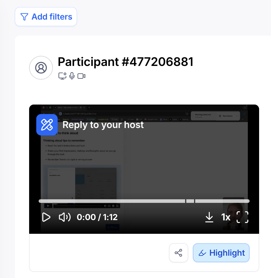 To create a highlight manually, from the Results page, select the Participants tab. Click the Highlight button beneath the clip, select the part of the Clip you'd like to highlight, add any specific notes for the highlight and click Add highlight.