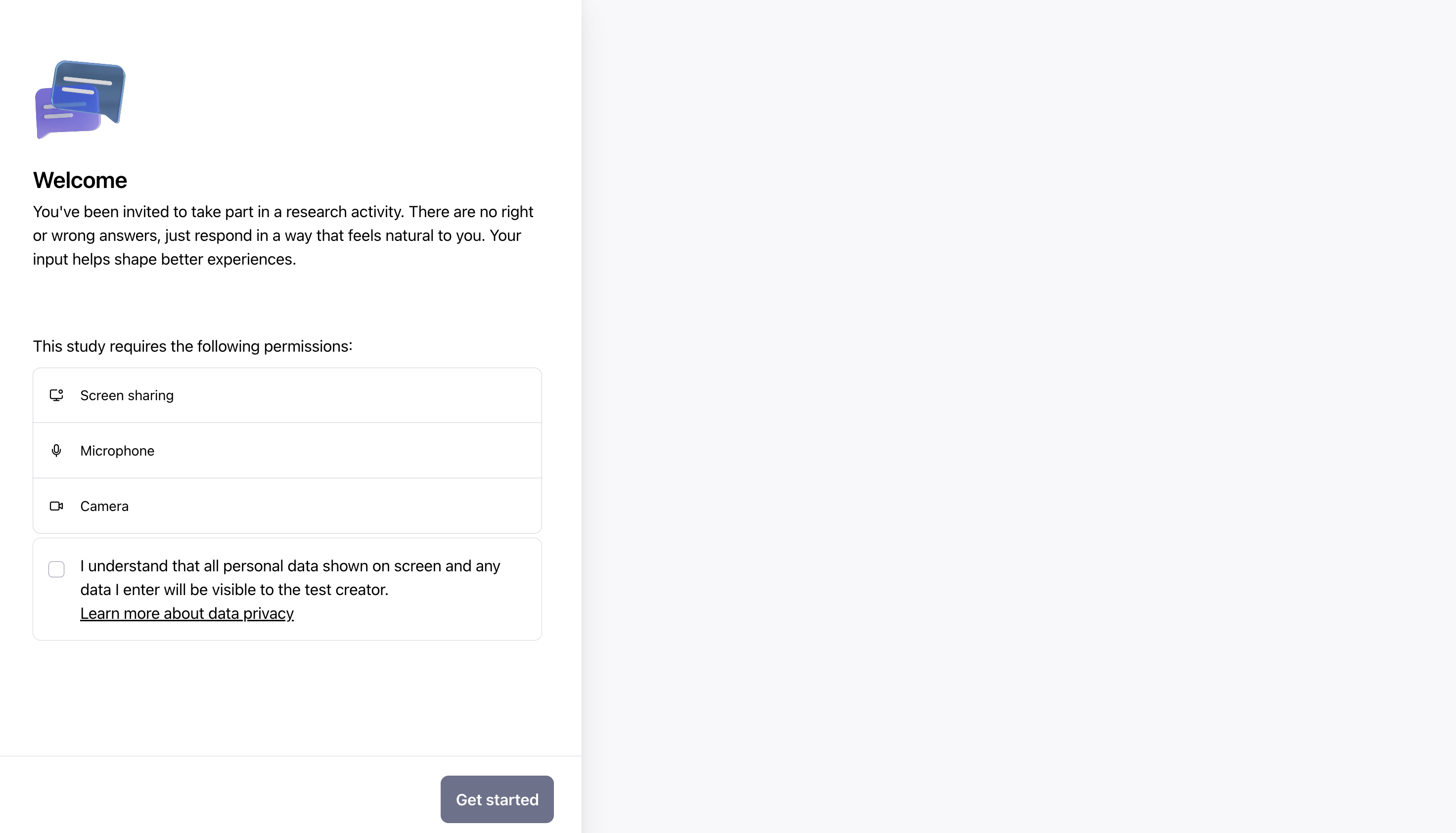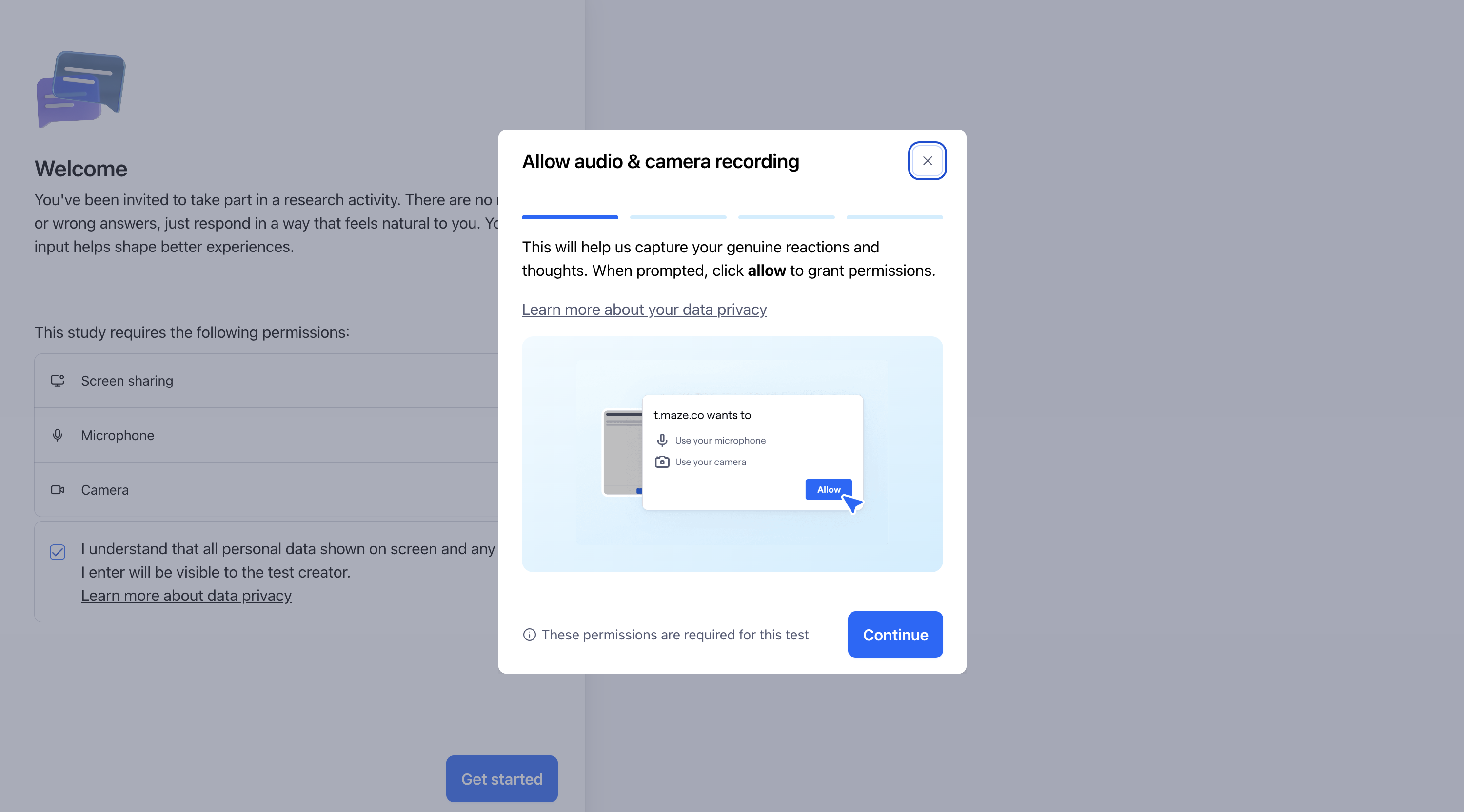 If you've enabled Clips in your maze, participants will see a note outlining the permissions required in the maze, and whether they're optional or required for continuing the test.