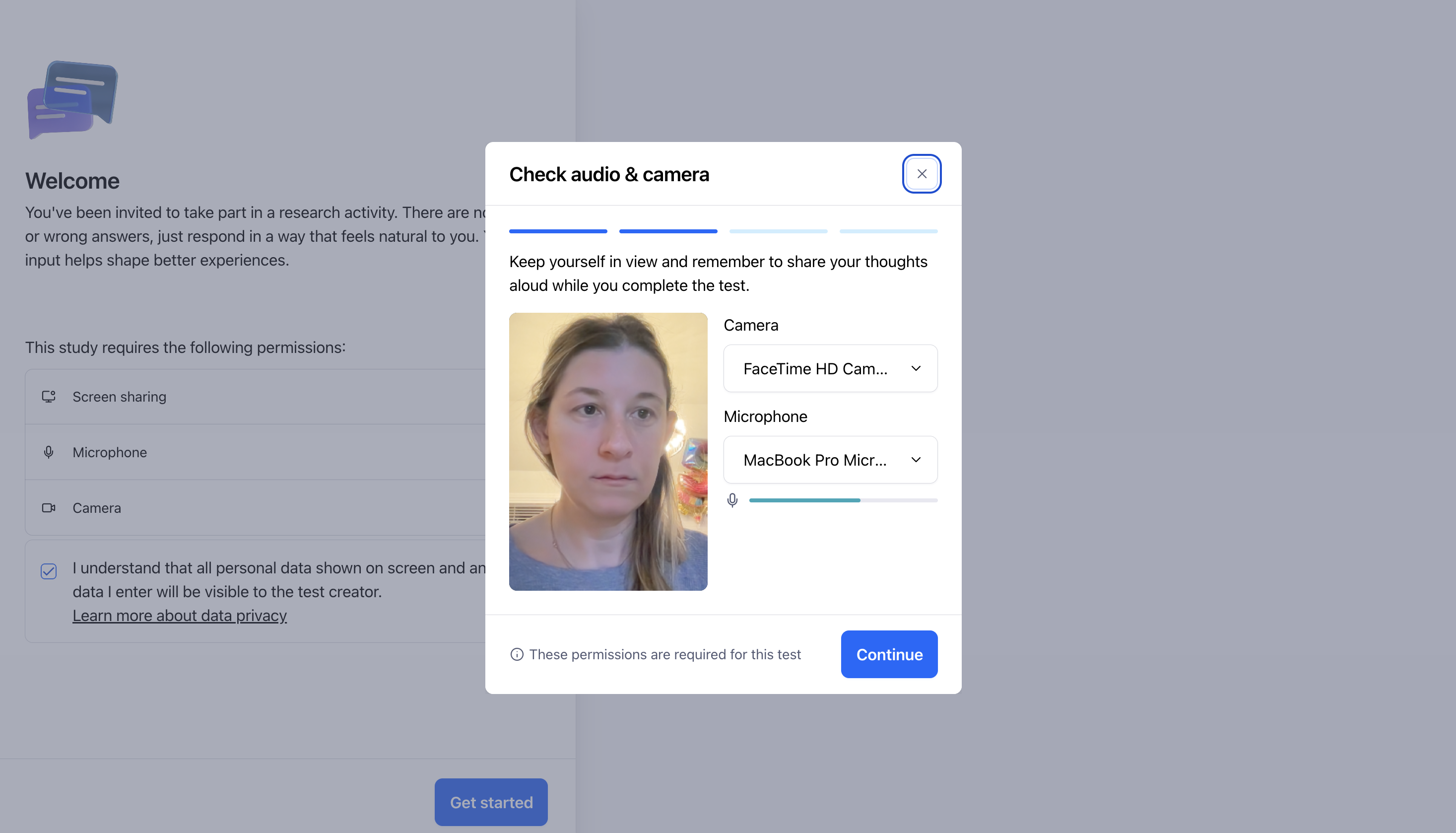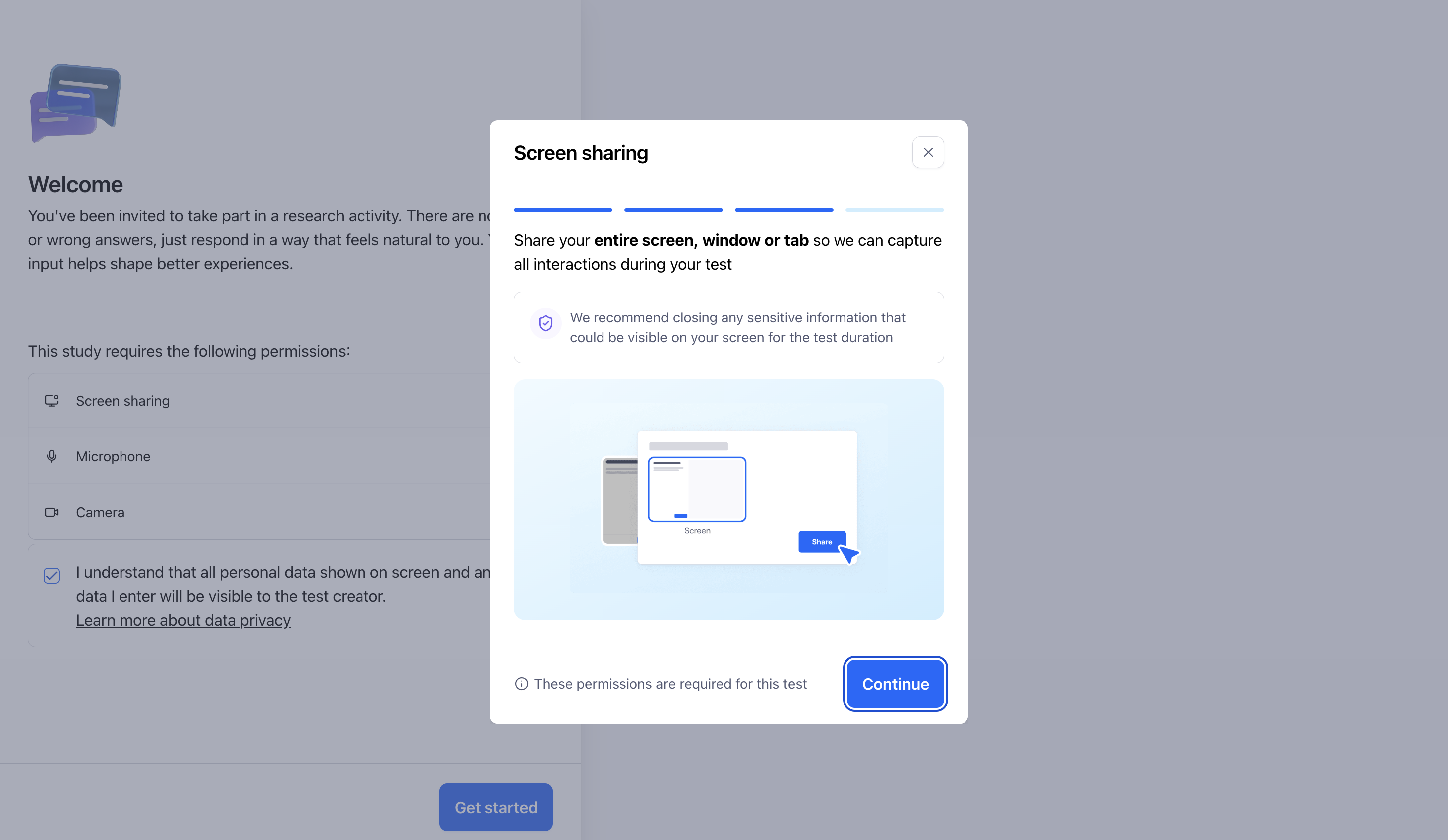 Once participants click on Get started at the beginning of the test, they'll be asked to confirm their microphone, camera and screen sharing settings.