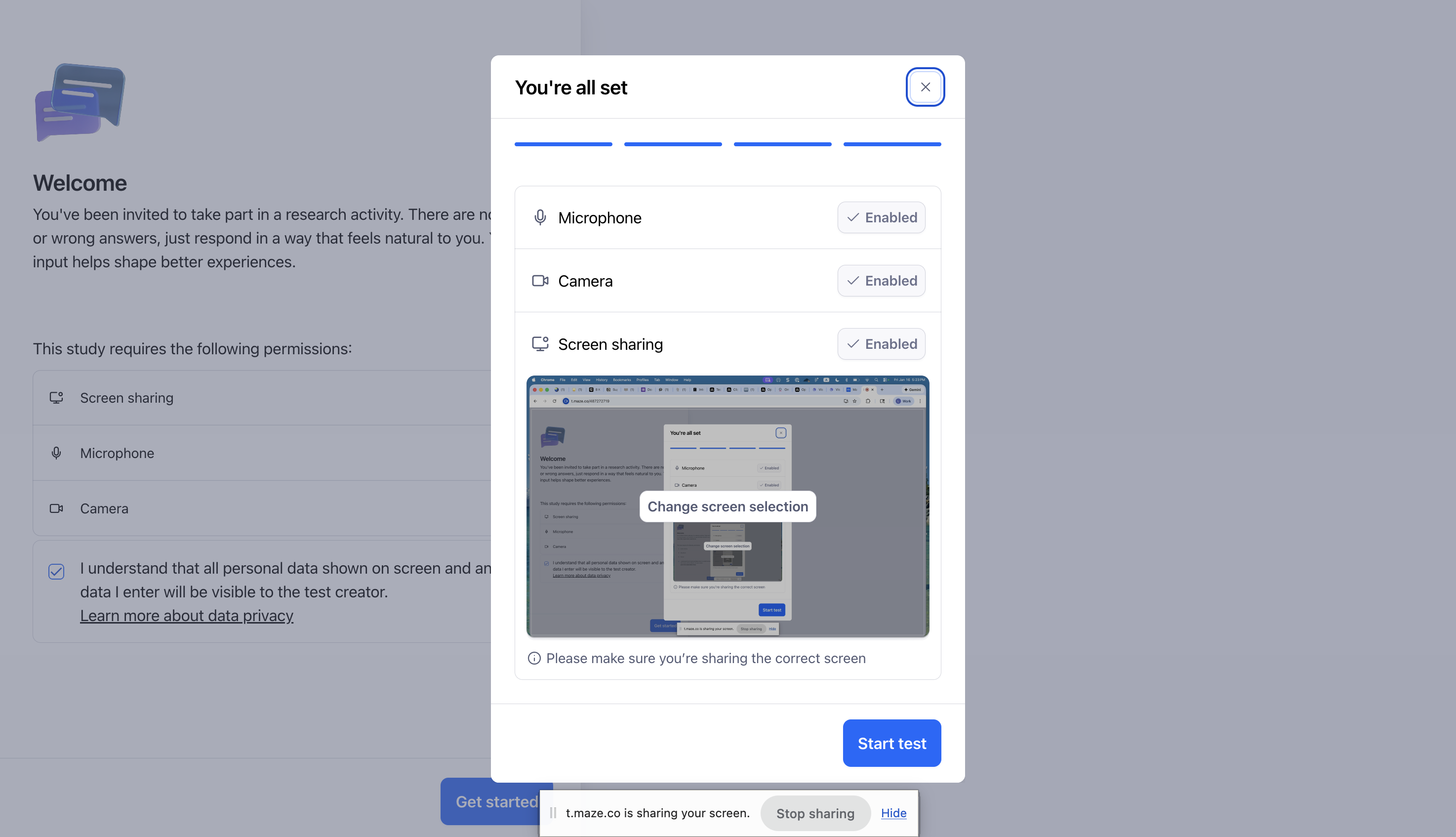 Finally, a modal will appear, confirming the recording settings for the maze. Clicking Start test will direct them to the first block in the maze.