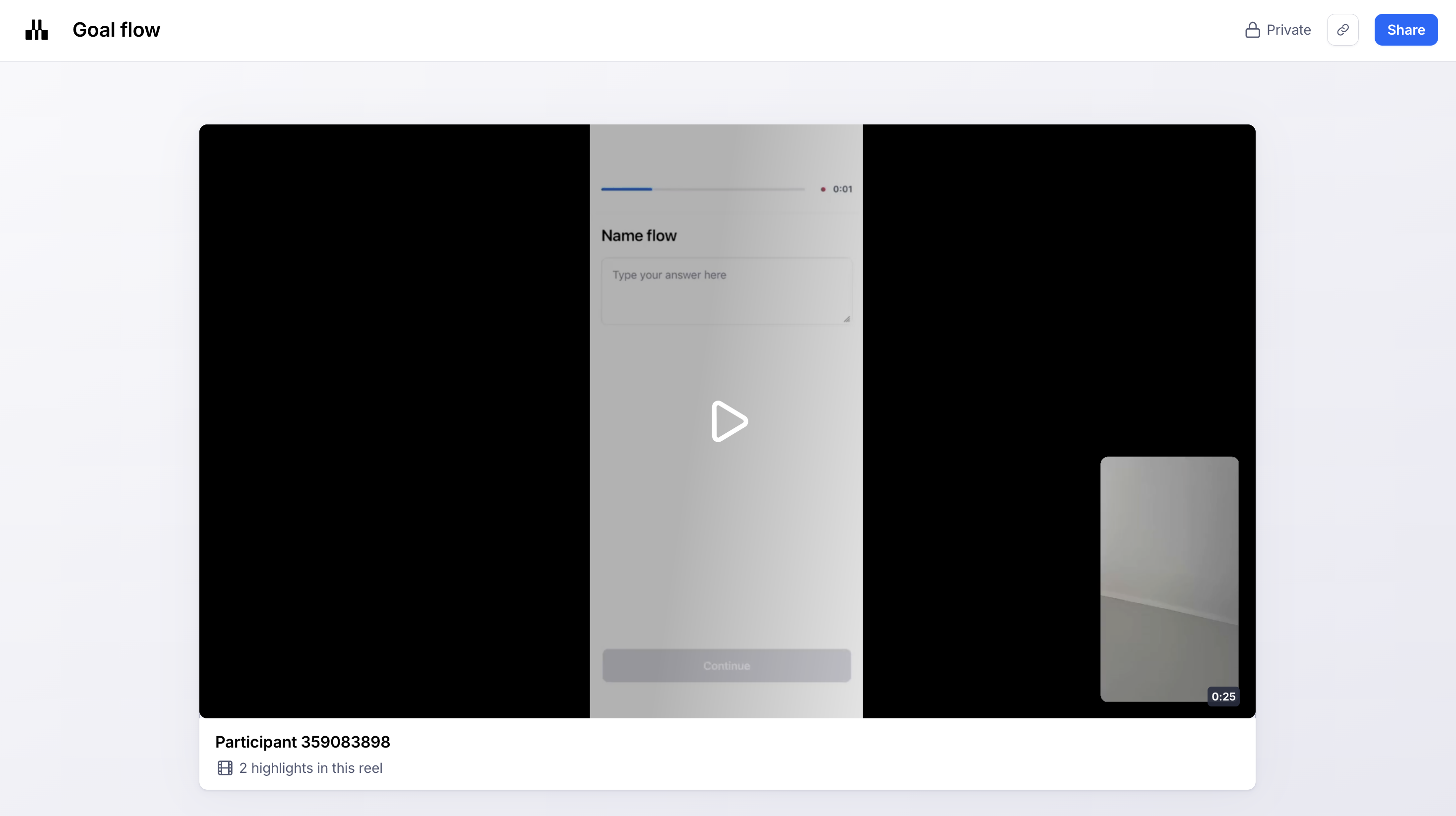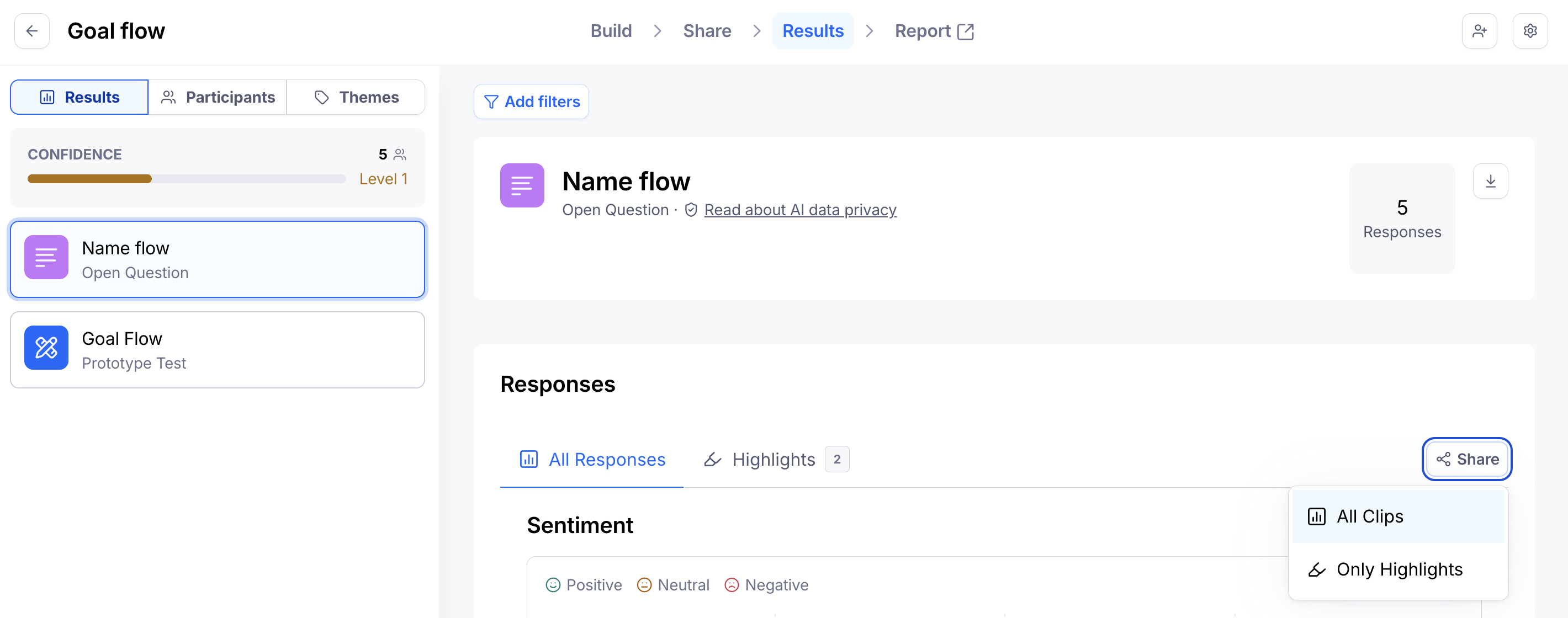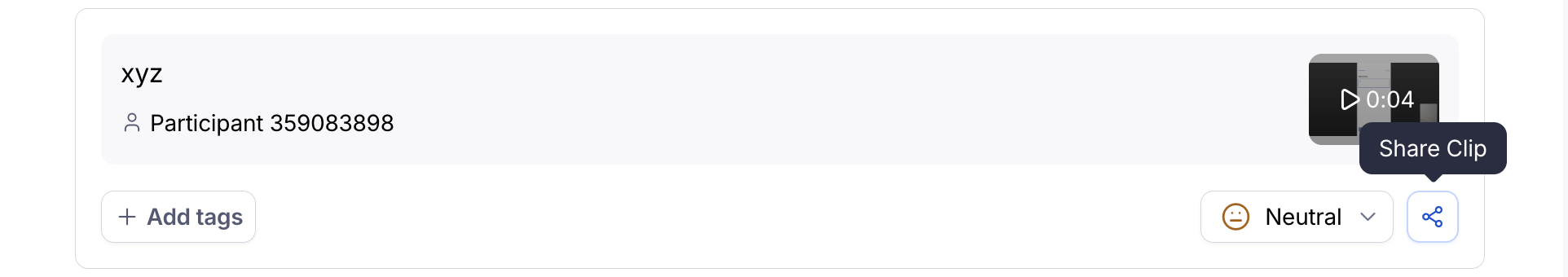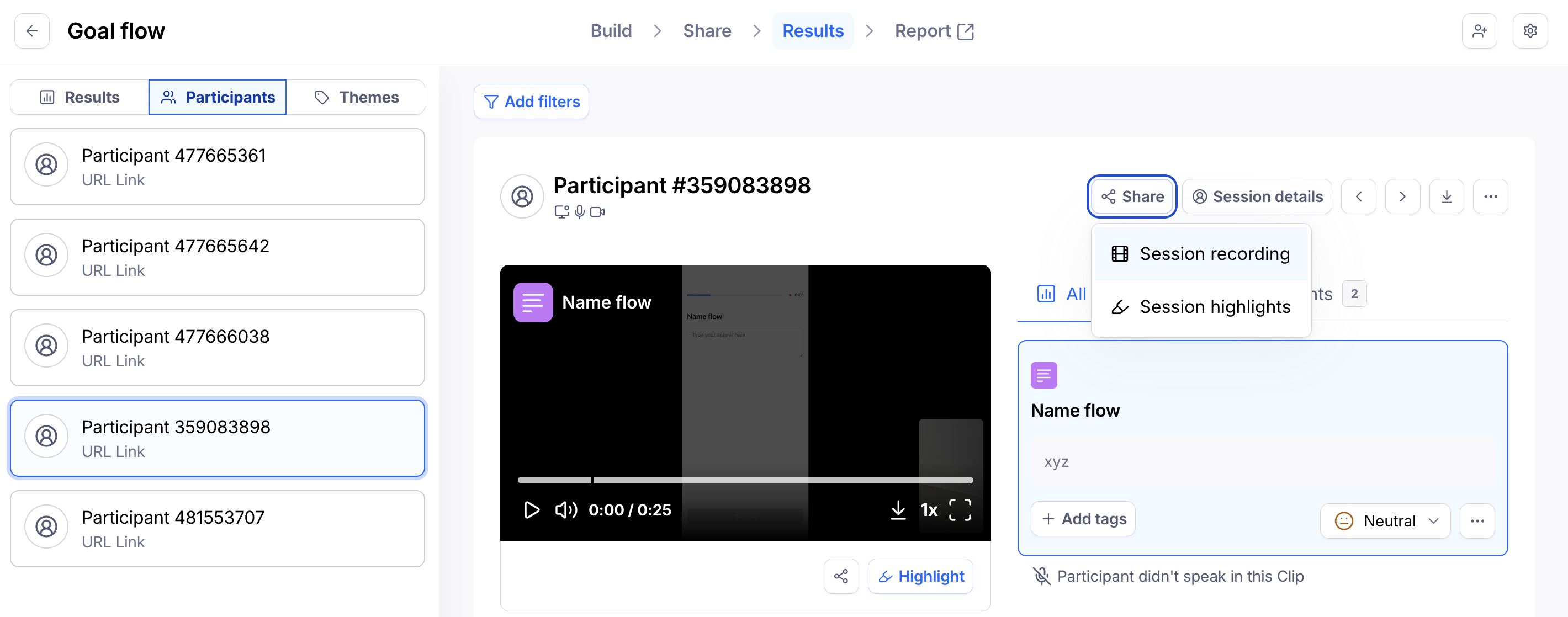 To share a single clip, open the relevant Clip from the Results dashboard, either from the Results or Participants tab. Learn more about finding Clips data in the results dashboard