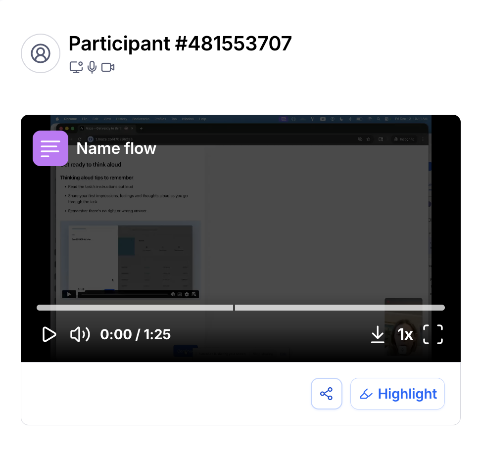 Highlights can be shared via direct link, embedding in other tools, or downloaded as video files. Highlights enable context preservation when sharing since you can watch the clip and see the related block responses alongside it.
