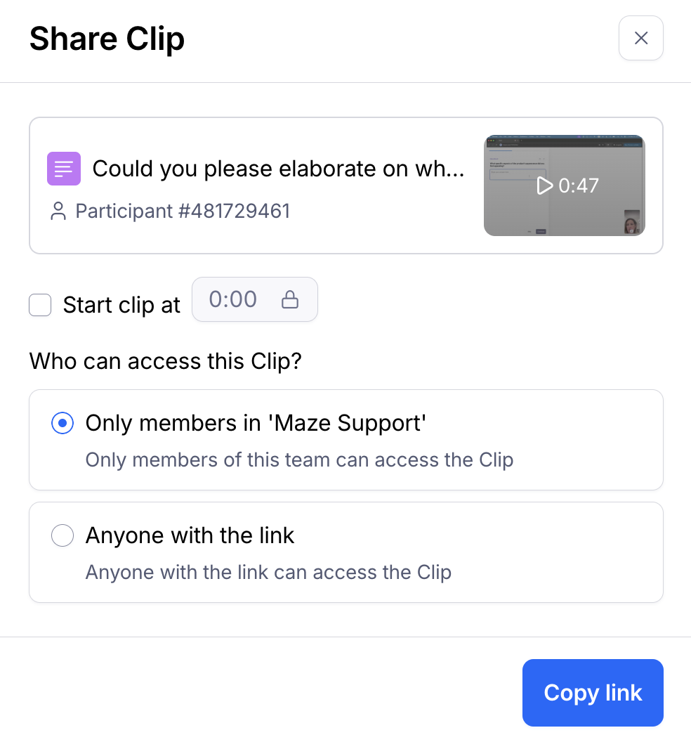 From the Results tab, navigate to the Responses section on the right hand side and click the Share clip icon for the Clip you'd like to share. Within the Share modal, set your desired settings and click Copy link to share the Clip.