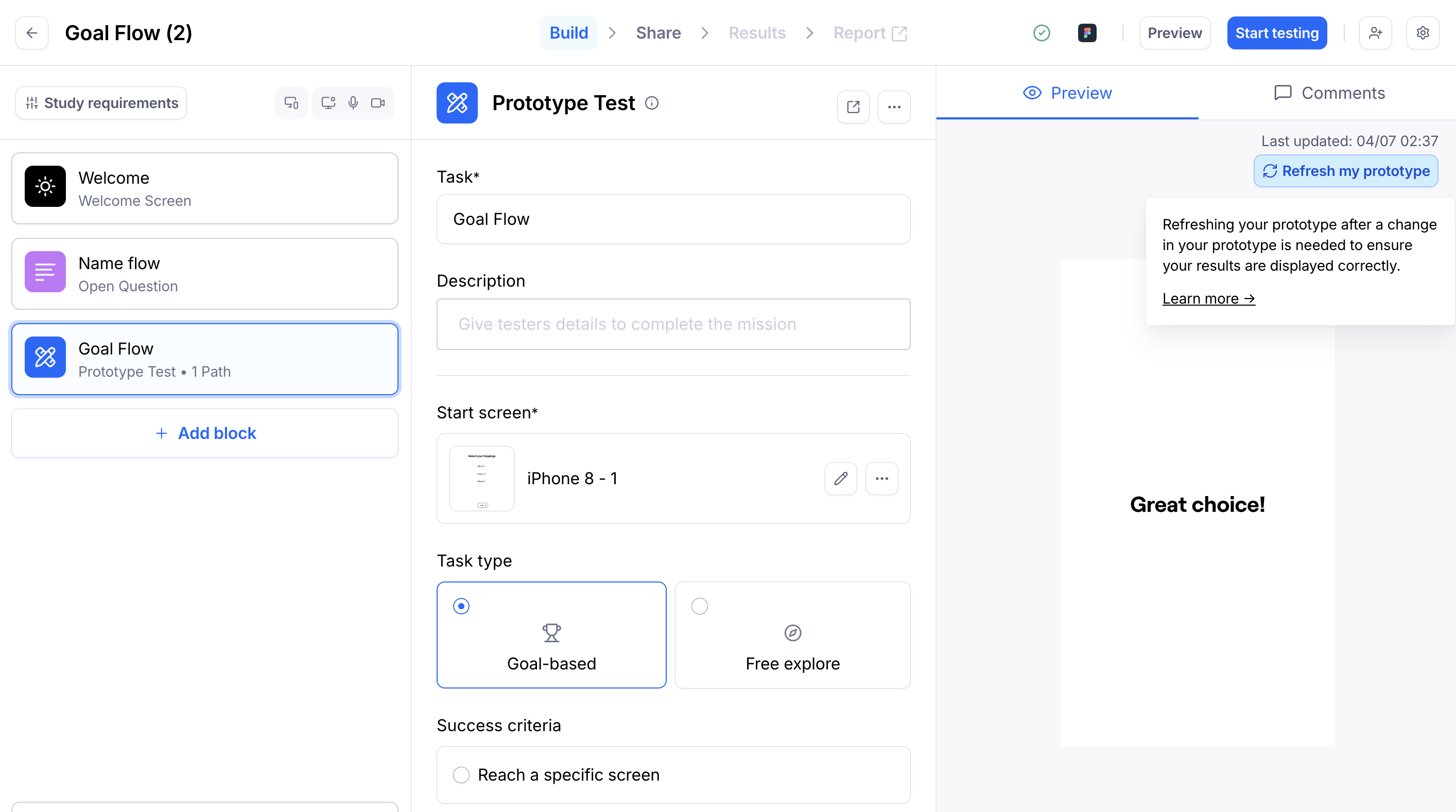Refresh the prototype in your draft maze every time you change your prototype. This will fetch the latest version of the prototype, while maintaining all the blocks and success criteria in the draft maze.