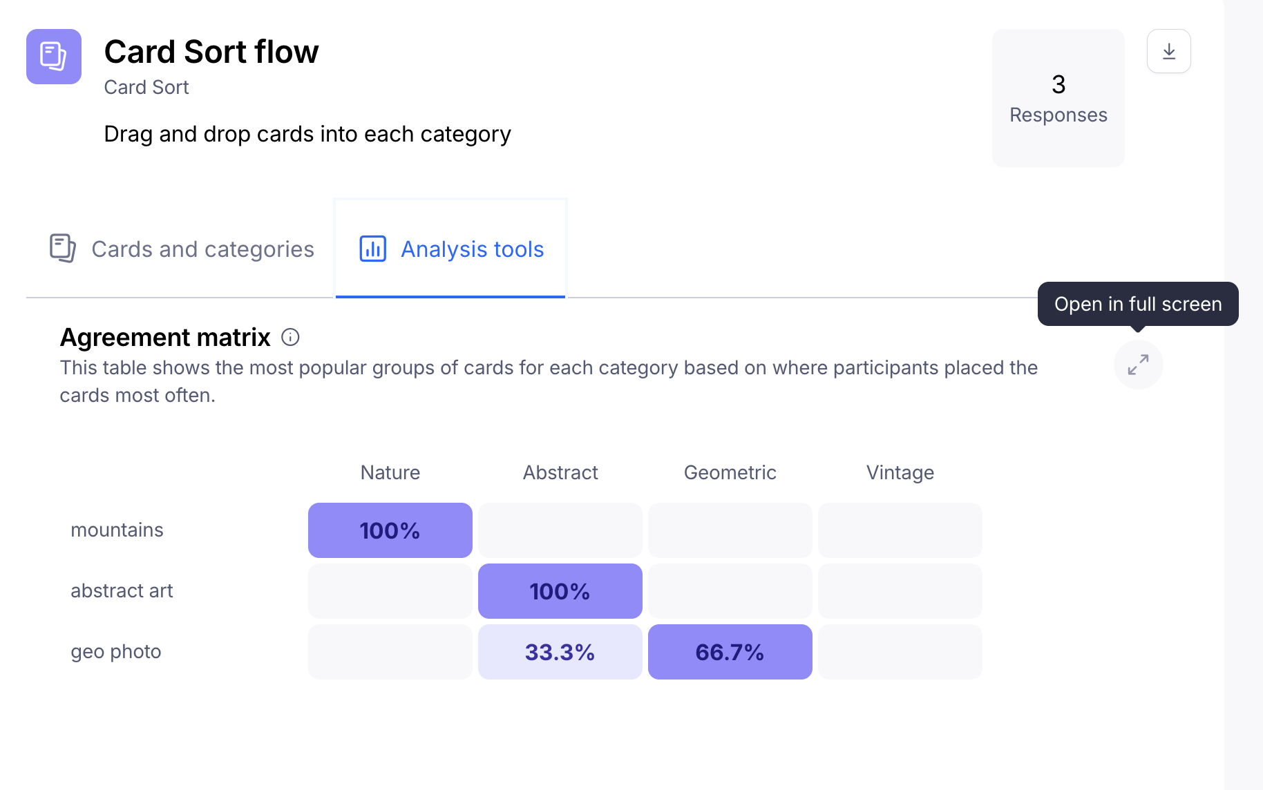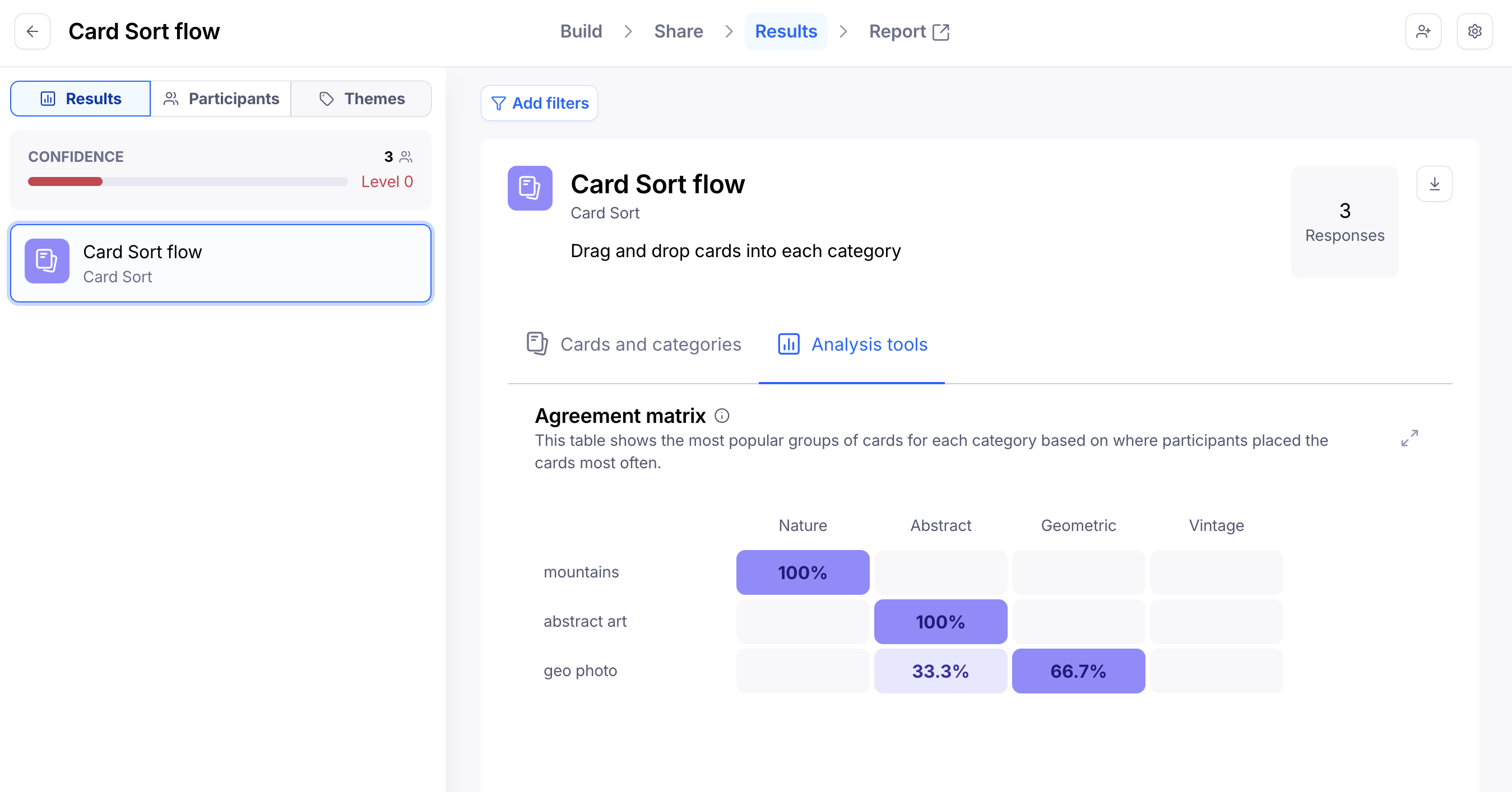 The agreement matrix gives your team a visual representation of how often users agree that a card belongs in each category.