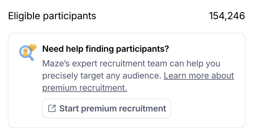 The price to recruit participants via premium recruitment is 5 Maze credits per recruited B2C participant and 9 Maze credits per recruited B2B participant. You will not be charged for your recruitment until it has completed; the Maze credits will be deducted from your Maze account automatically once your recruitment order has been completed.
