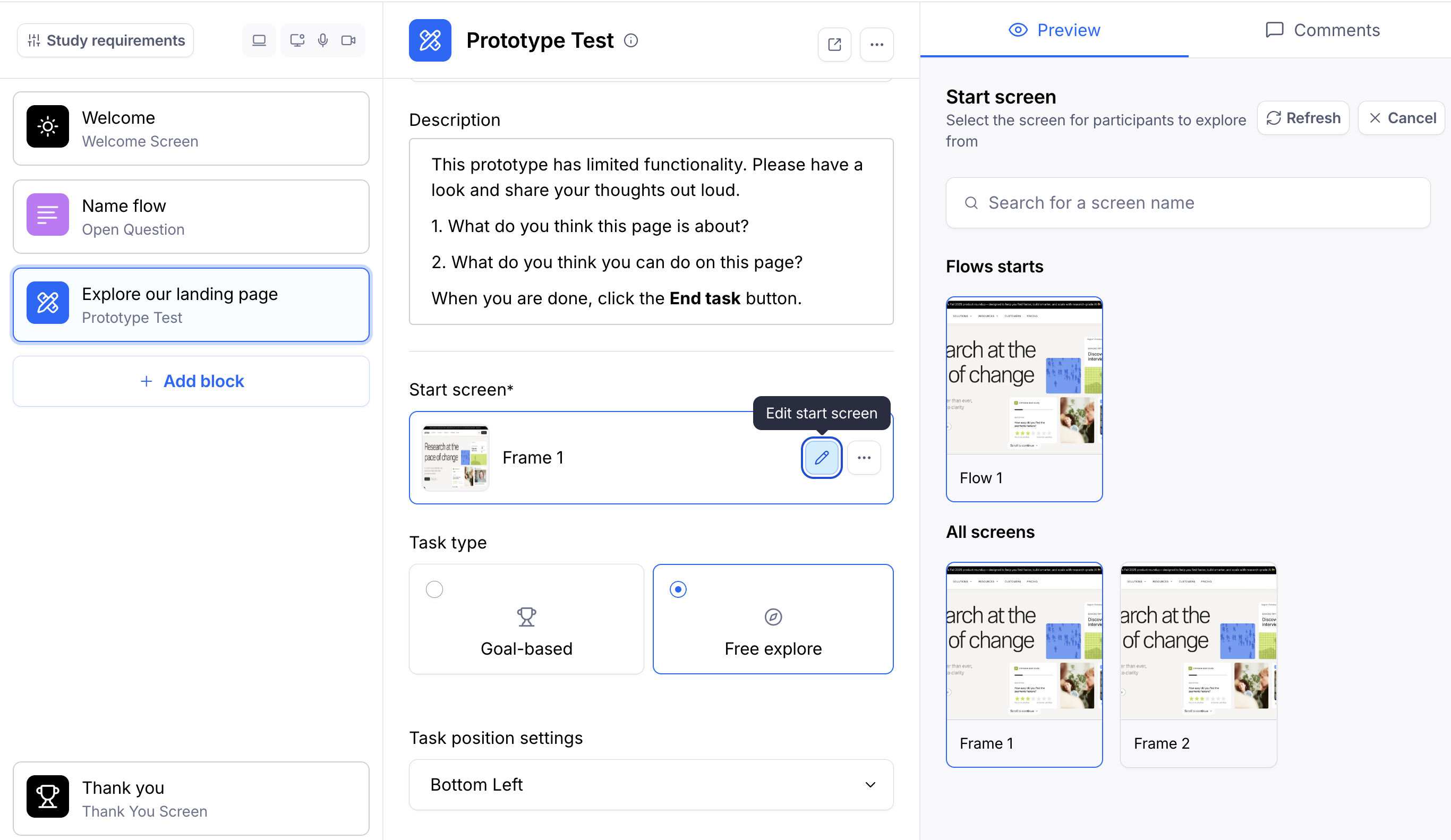 To change the start screen, click the Edit start screen button. This will display all imported screens. Click a screen to select it as the start screen.
