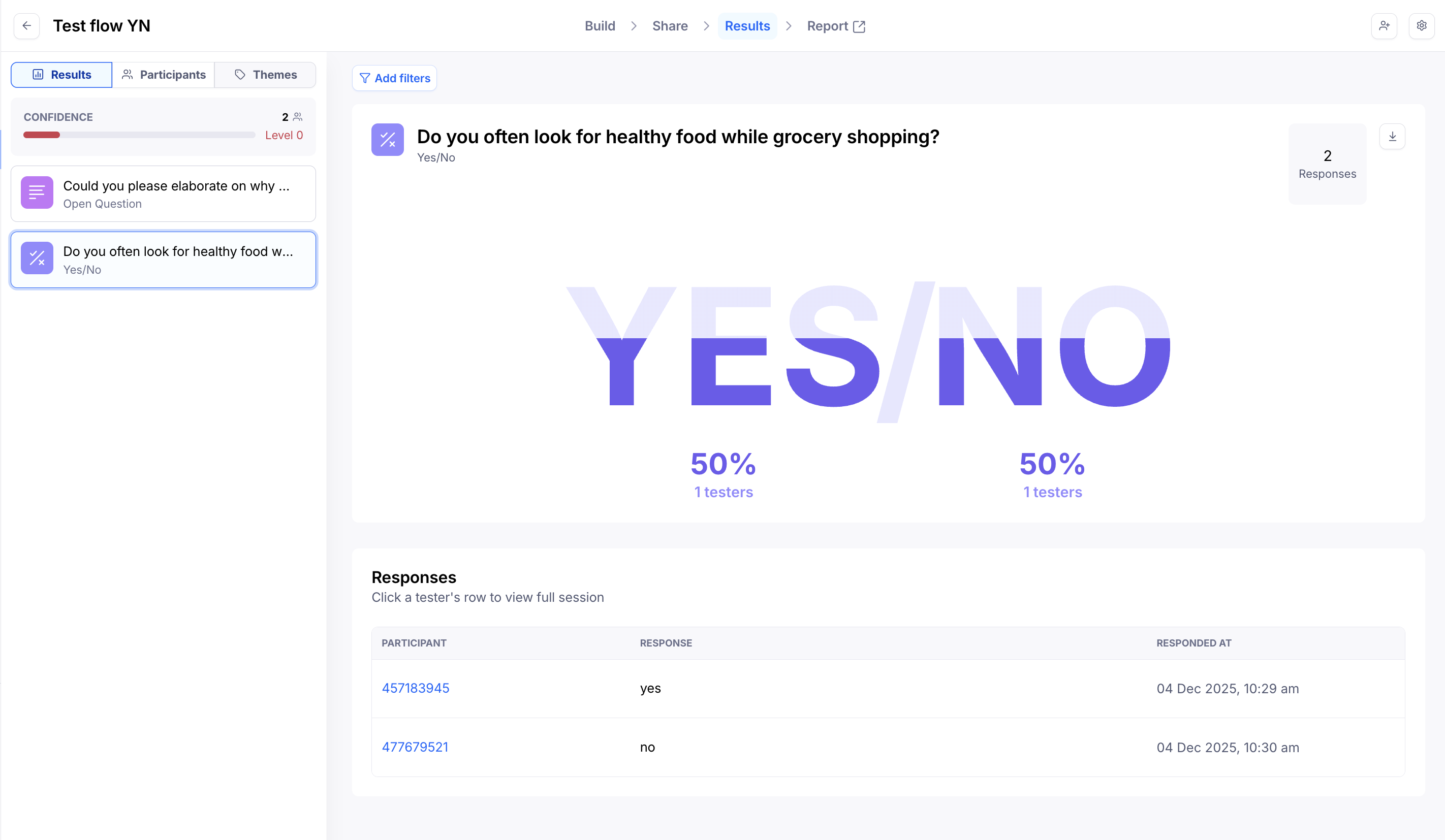 When viewing results for a Yes/No question, you'll see an aggregated view of all answers. Scroll down to the bottom to see the individual responses.