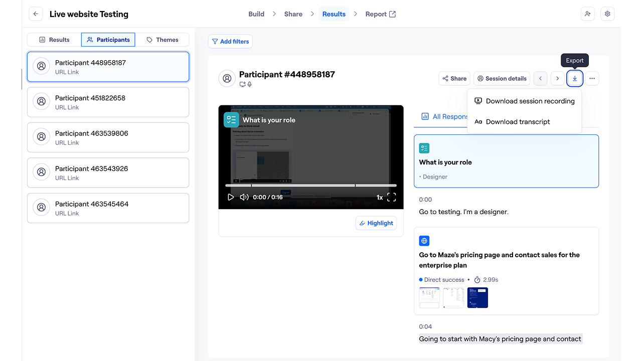 For individual sessions, navigate to the Participants tab in Results and click the download/export icon. The Download transcript option will download your transcript as a txt file, instantly.