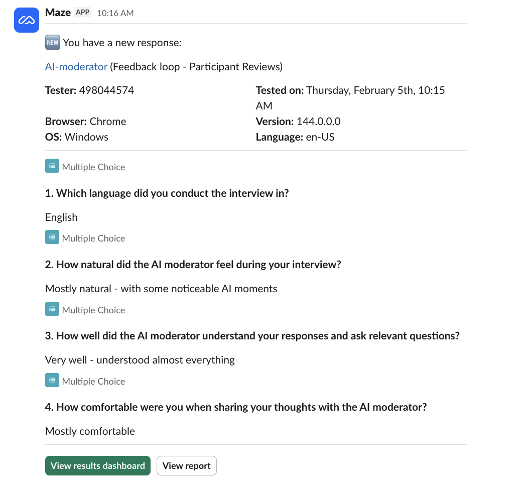 Once you've successfully connected your Slack channel to Maze, you'll receive a notification every time someone completes your maze. The following information will be included: