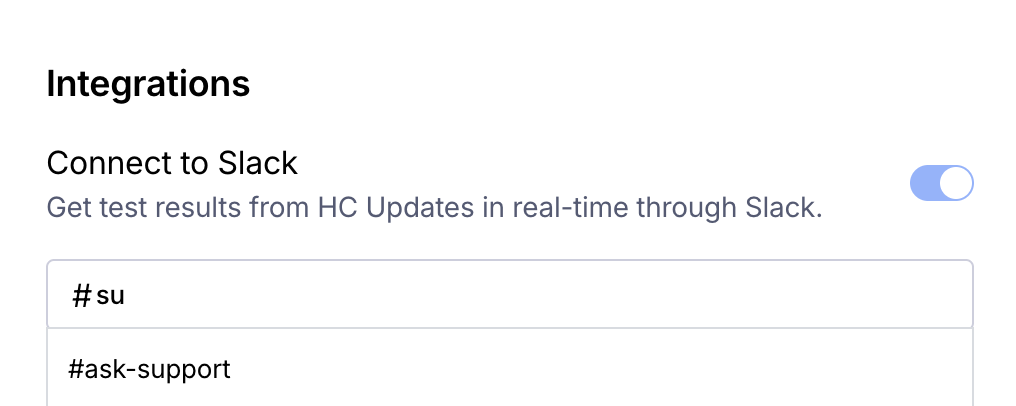 Under 'Connect to Slack', either click Connect (if it's you're first time using the integration) or toggle the switch to on and from the dropdown, select the channel you'd like to send updates to.