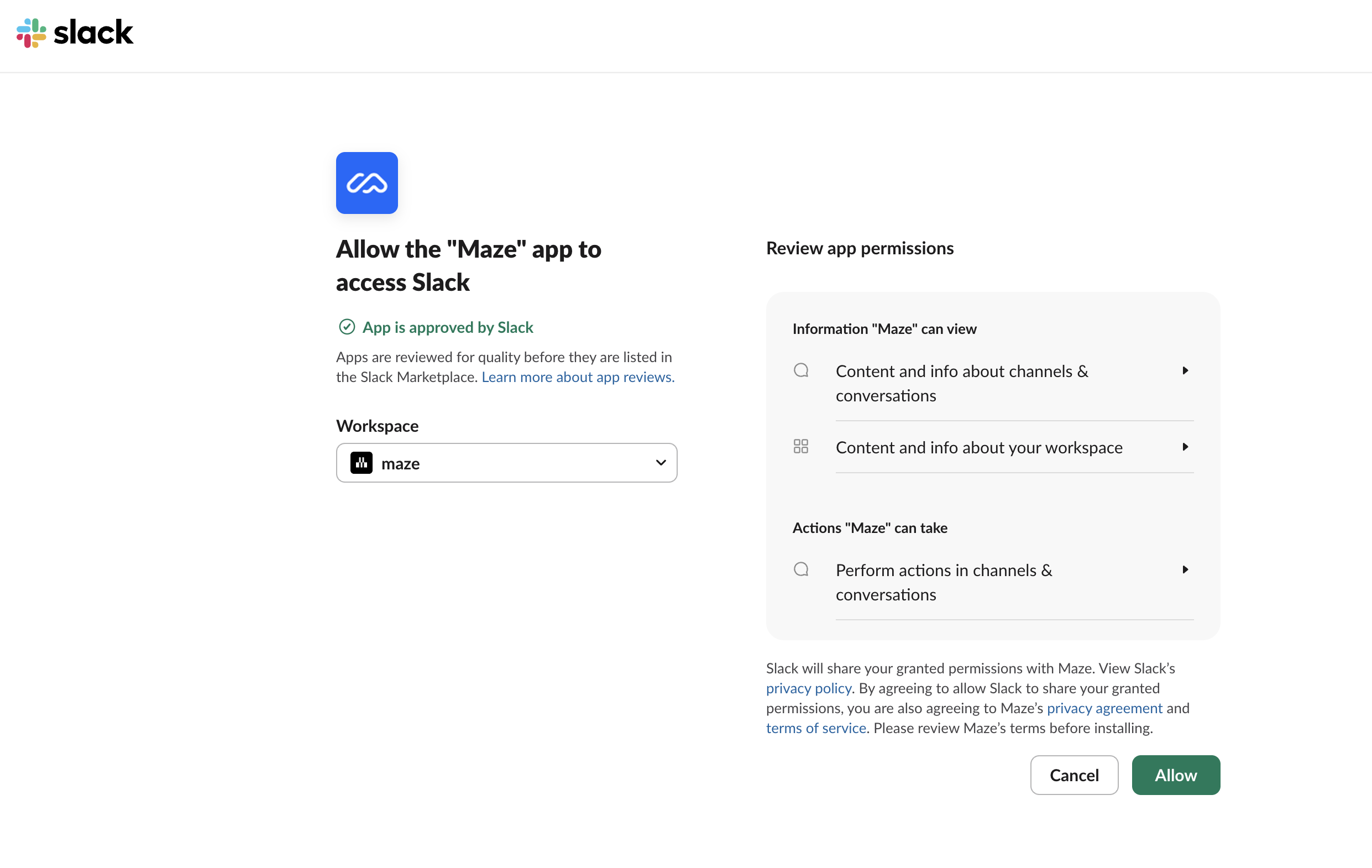 If this is the first time using the Slack integration, you'll click Connect. A Slack integration page should appear. Here, you can review the required permissions. Click Allow to authorize the Maze integration in your workspace.