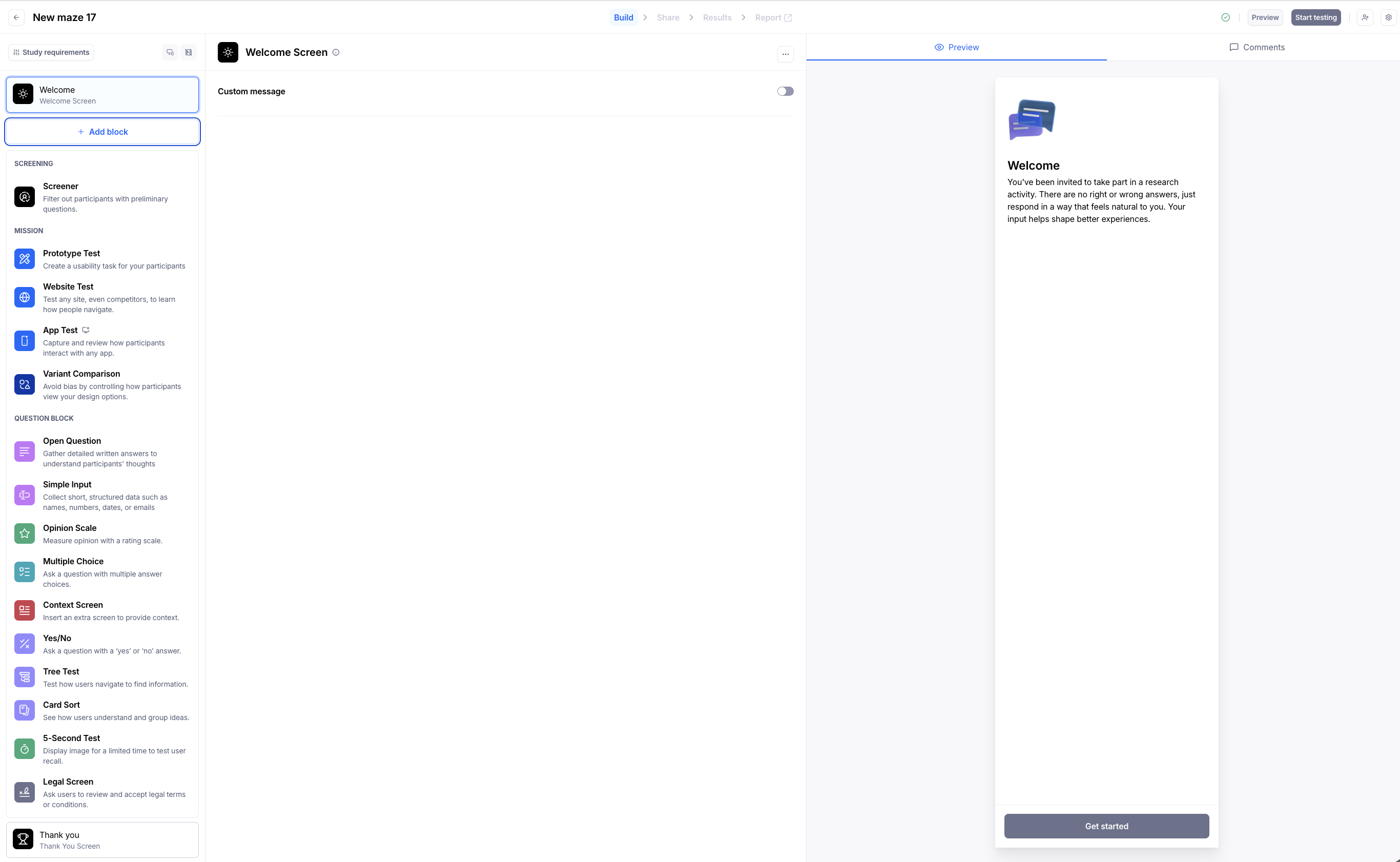 The Welcome Screen is the first screen in your maze. Every maze has a Welcome Screen by default with a message for your test participants. You can change the message on a paid plan.
