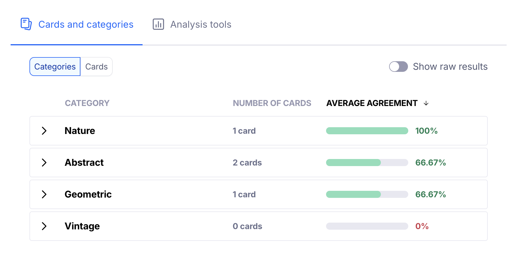The agreement matrix groups cards under each category based on their highest agreement rates. It gives you a visual representation of how often cards appeared in each category. Learn more