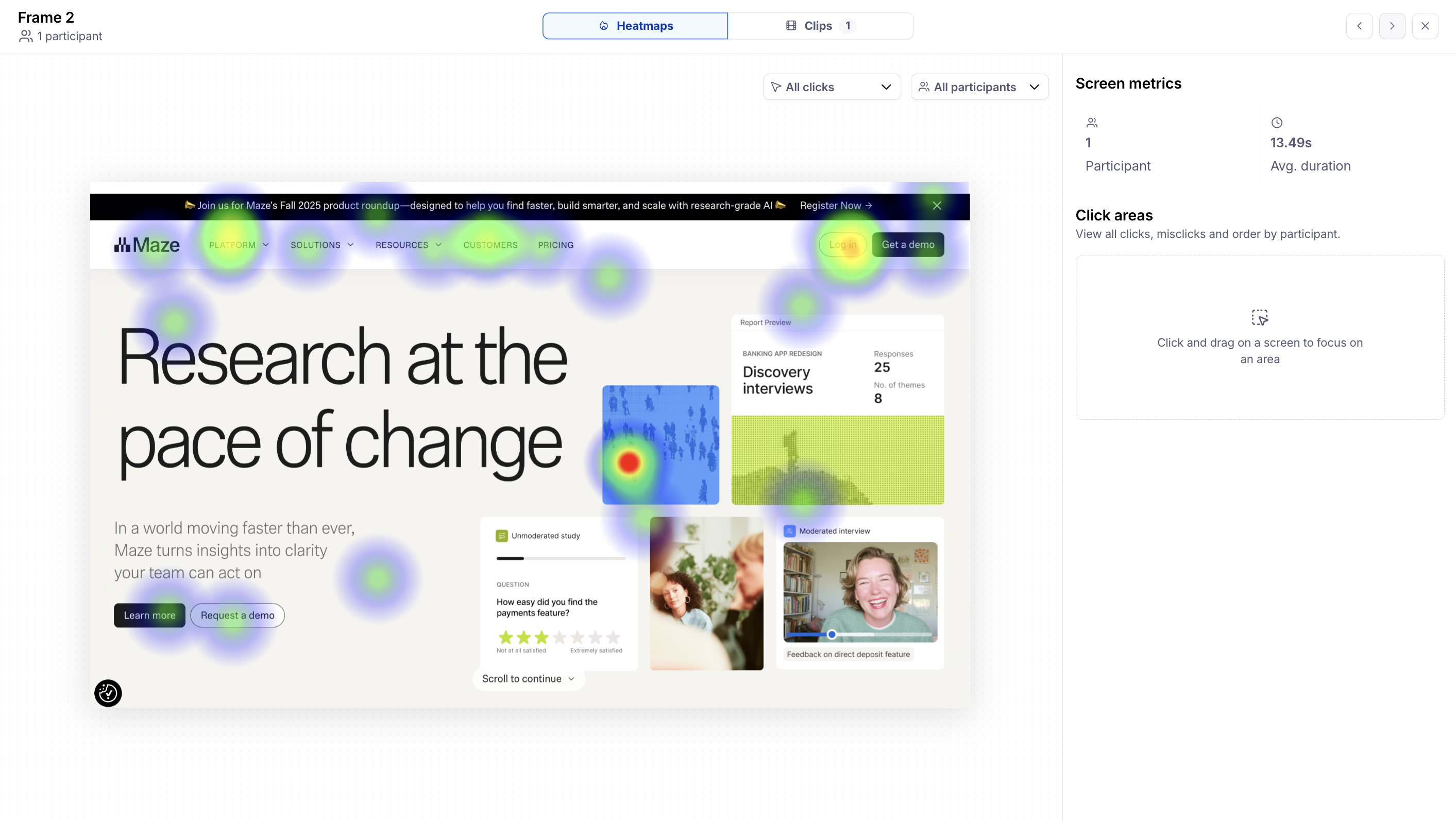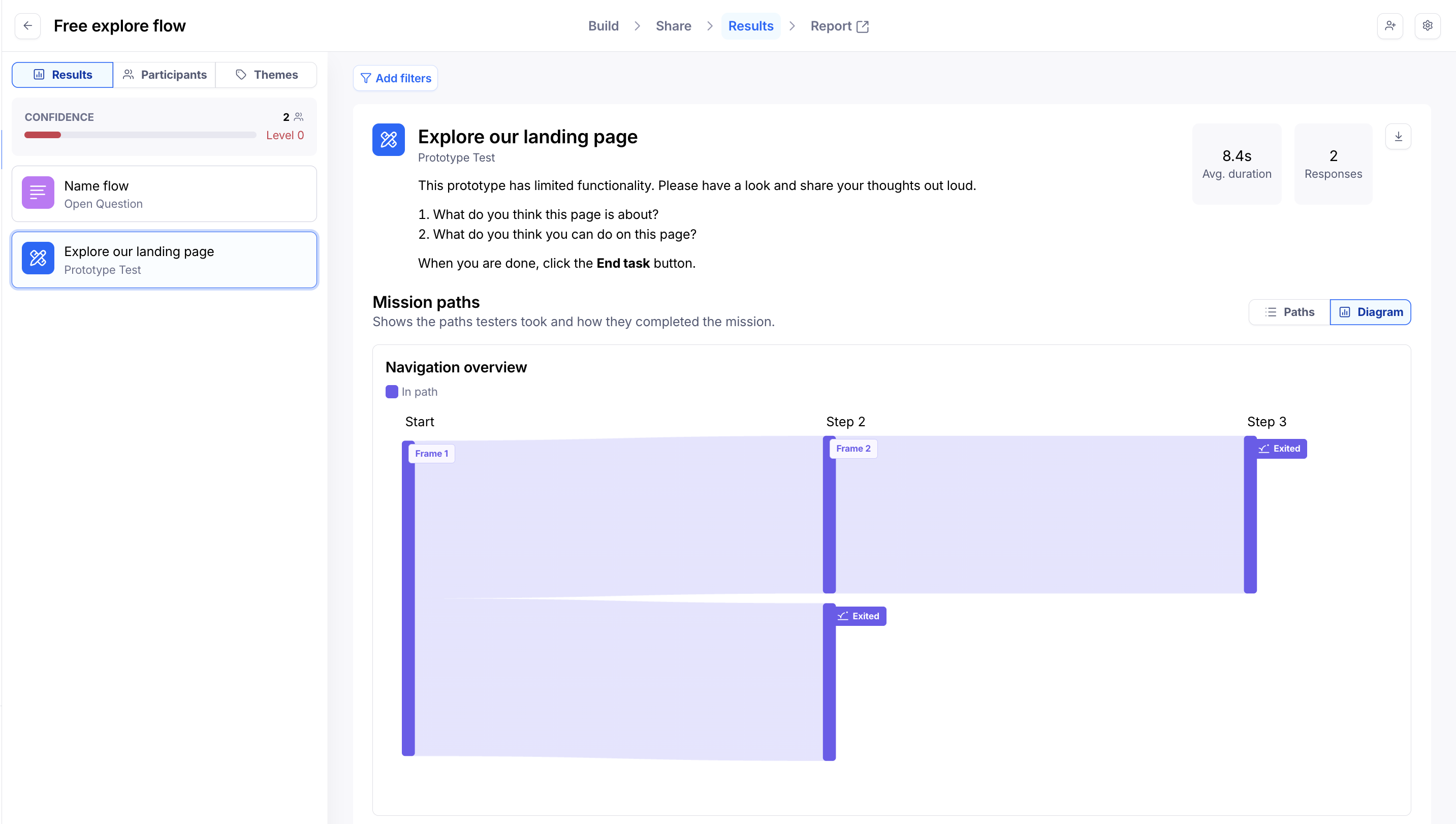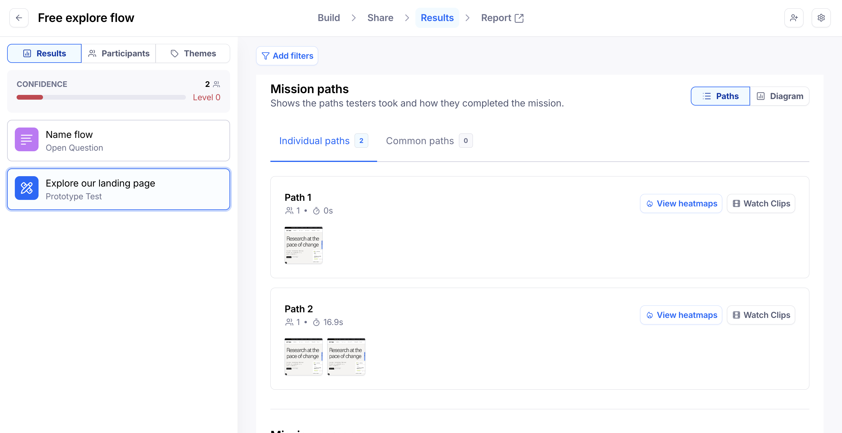 Results allow you to get qualitative insights into your participants’ flow through the prototype. You’ll be able to see information on common paths, heatmaps, click data, as well as Clips recordings (if enabled).