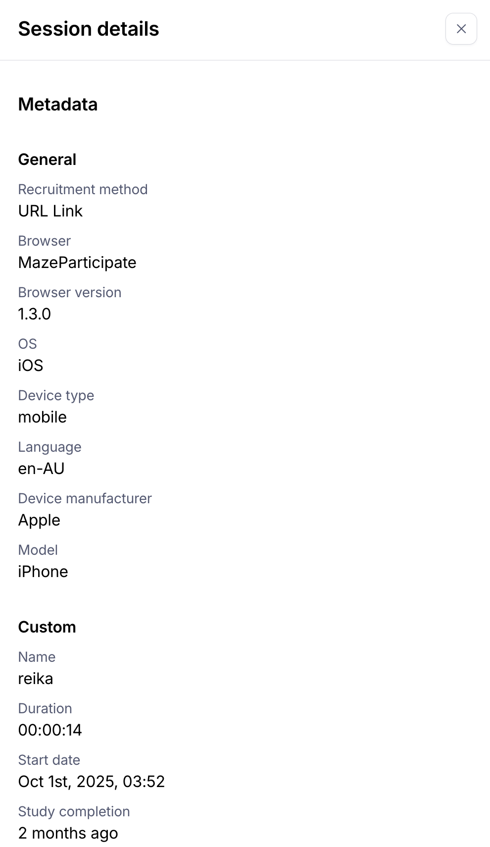 Maze allows you to add tags/parameters to your unmoderated study URL to record custom metadata on individual sessions.
