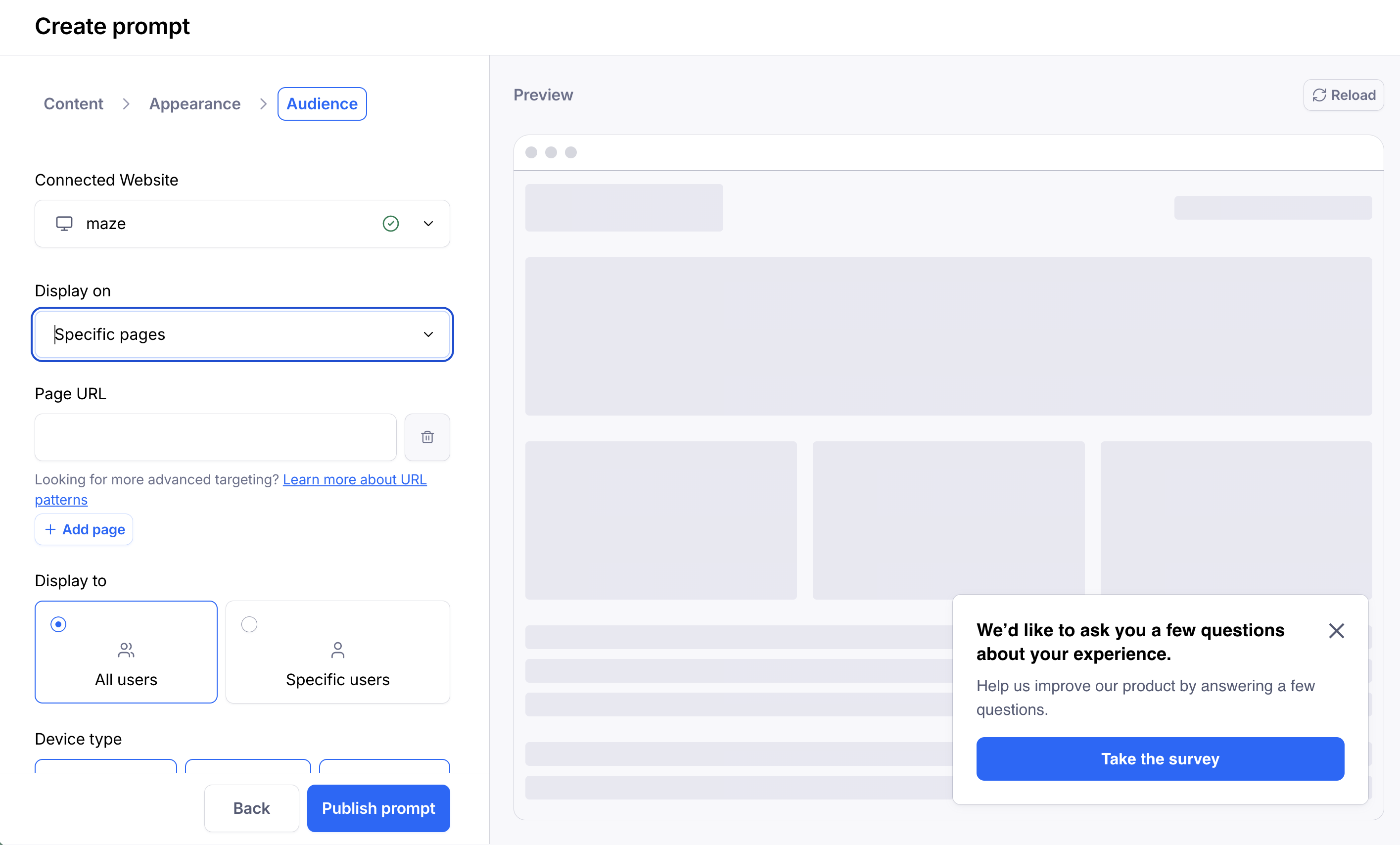 When defining an audience for your in-product prompt, you can choose whether you want to display the widget on every page of the selected website, or only on specific pages.