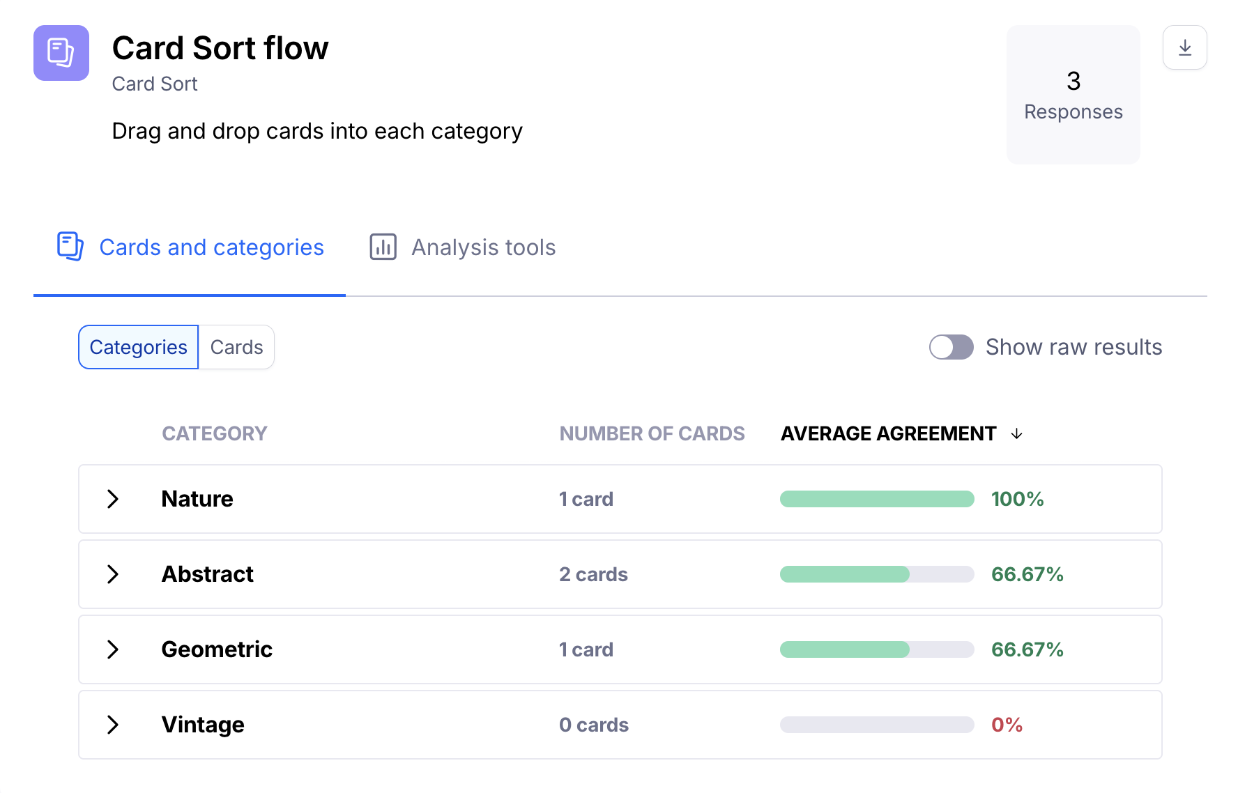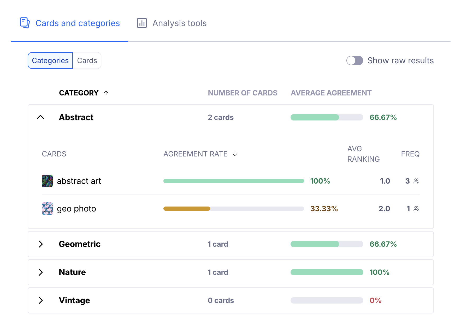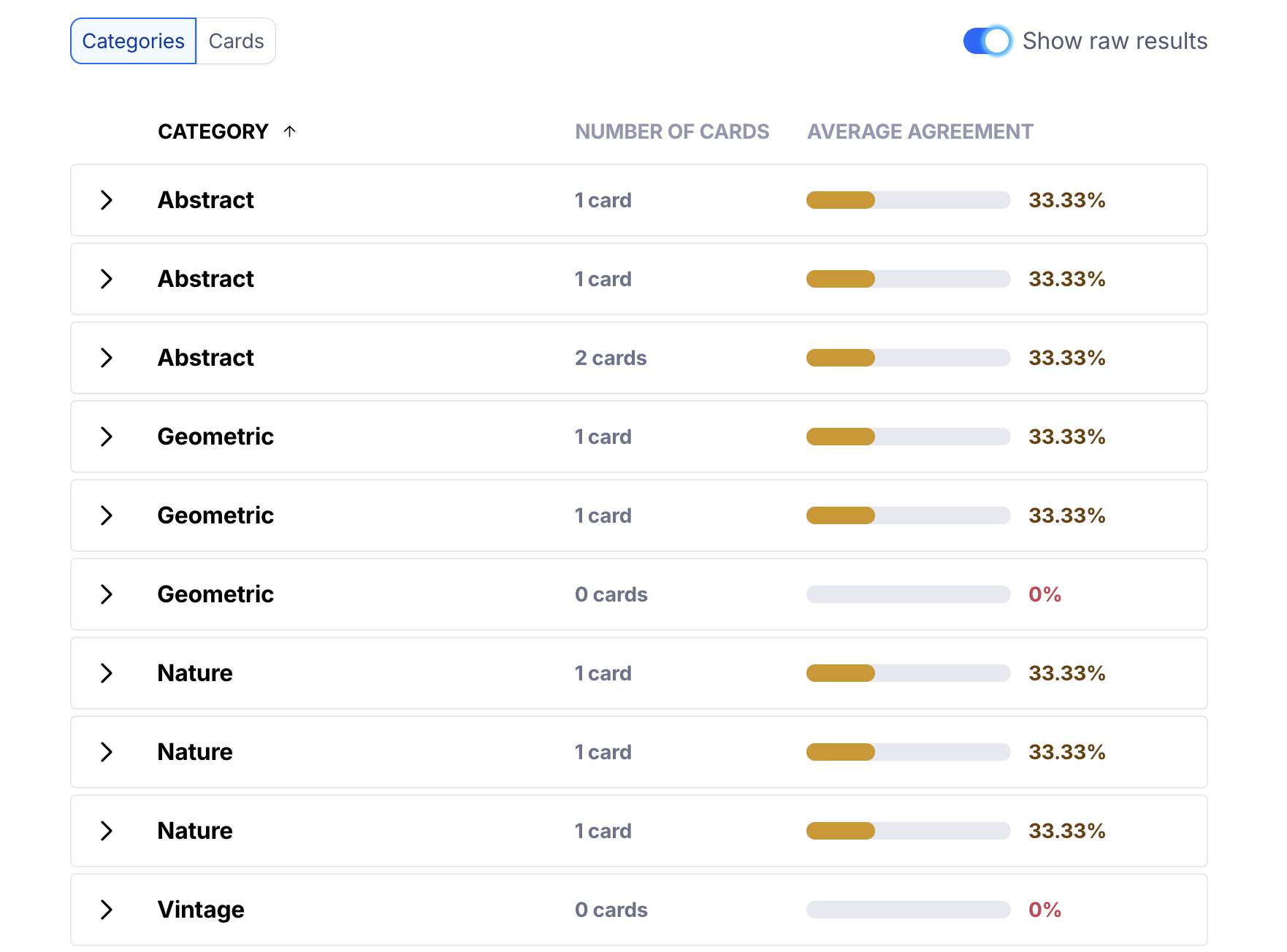 Show raw results: Displays the original results collected from the testers, without automatic grouping. For instance, if 3 testers sorted cards into the "Nature" category, this category will appear 3 times, each displaying the cards for each tester.