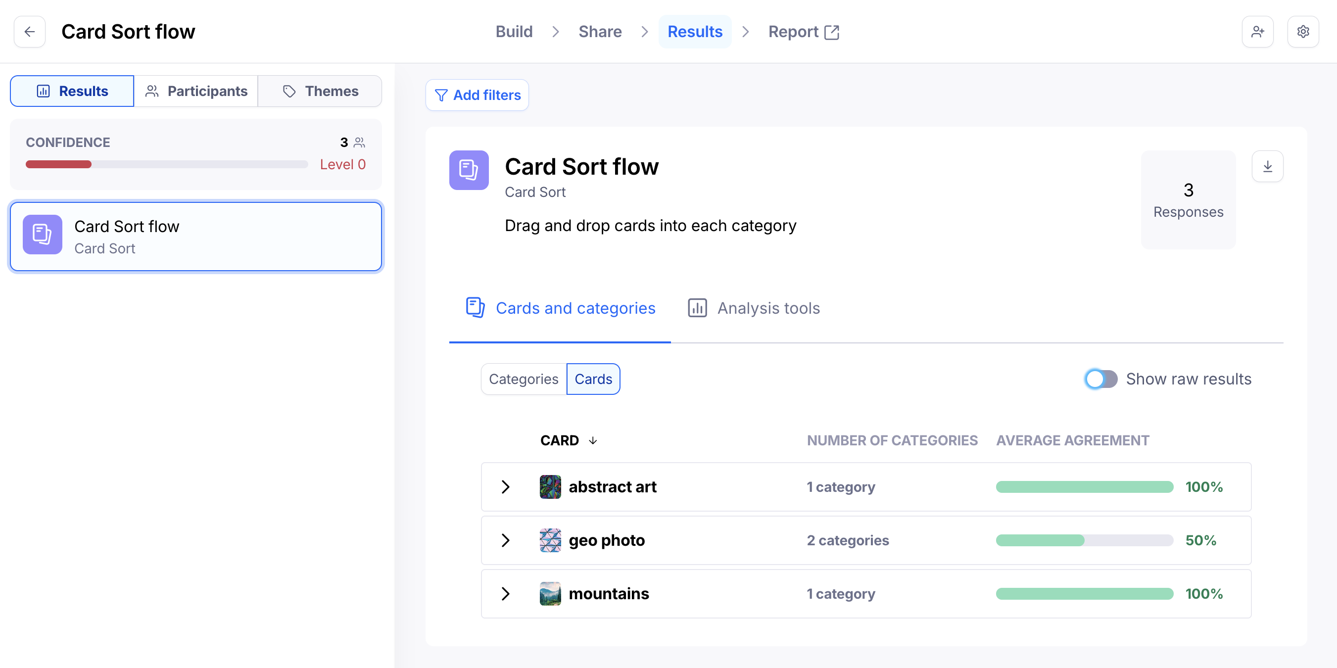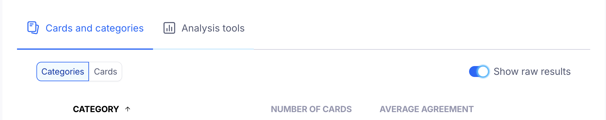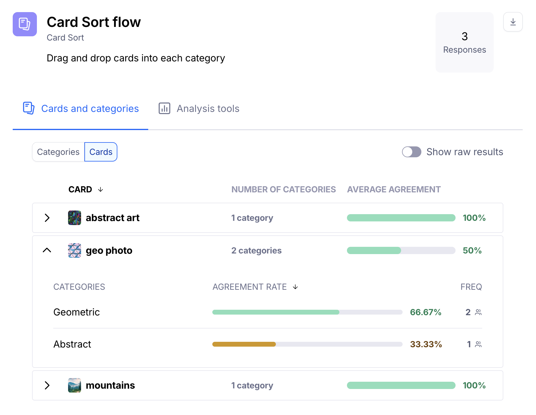 Show raw results: Displays the original results collected from the testers, without automatic grouping. For instance, if 3 testers sorted cards into the "Nature" category, this category will appear 3 times, each displaying the cards for each tester.