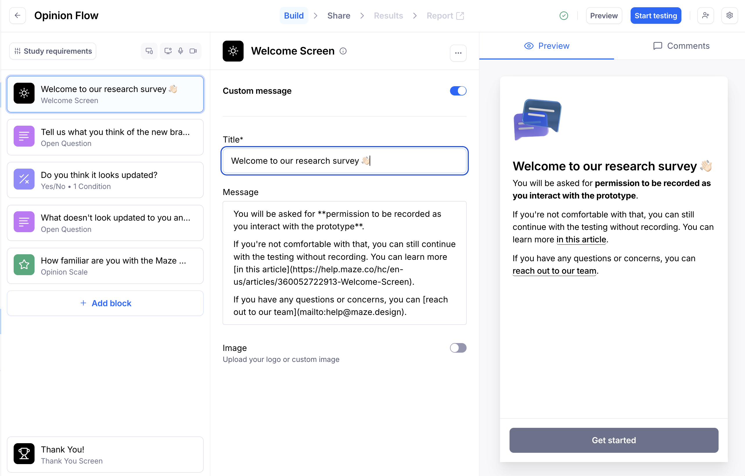 Adding a custom welcome message is a great opportunity to introduce participants to your test/survey and help them understand what’ll be required of them. This allows you to give participants an onboarding experience without the need to call or email them all the instructions. Learn more about introducing your maze to testers