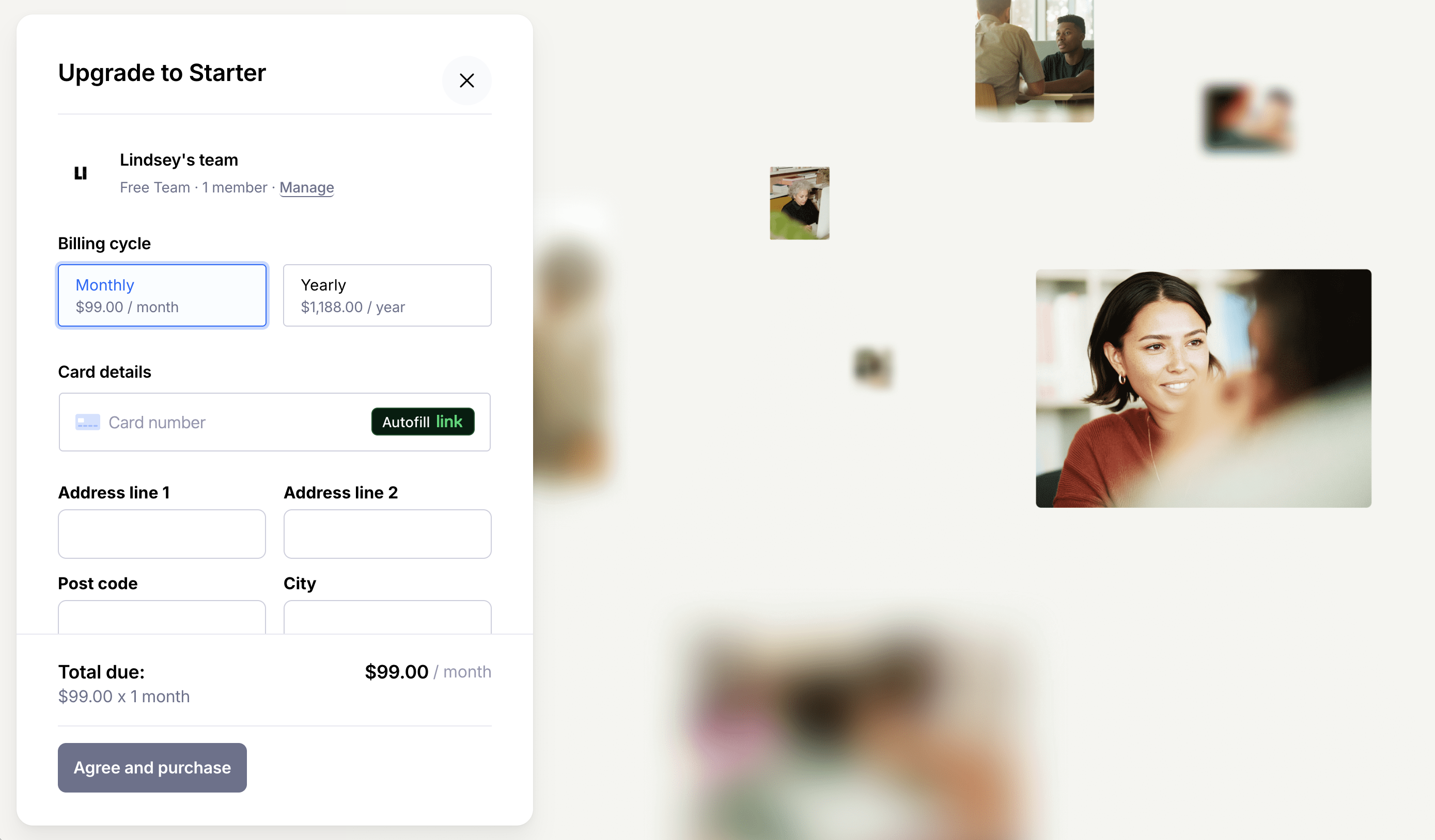 - Enter your card details and use the toggle to select annual or monthly billing.