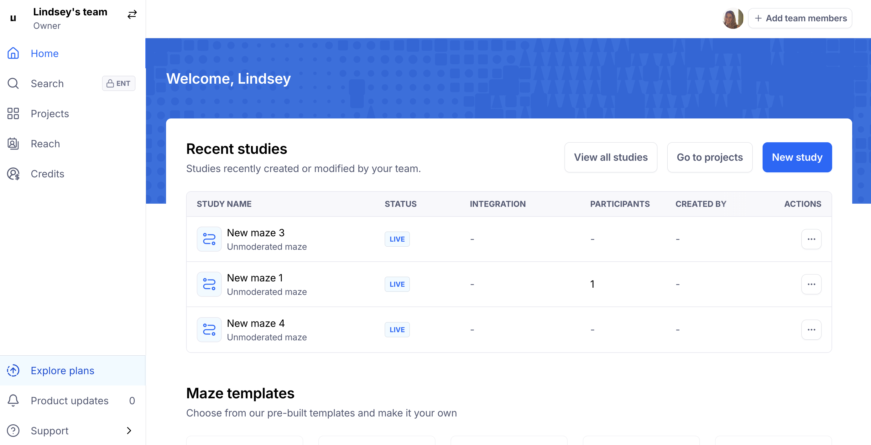 Alternatively, If you're creating a new account with Maze, you'll automatically open a trial team, which includes 30 days to try all of our premium features completely free.