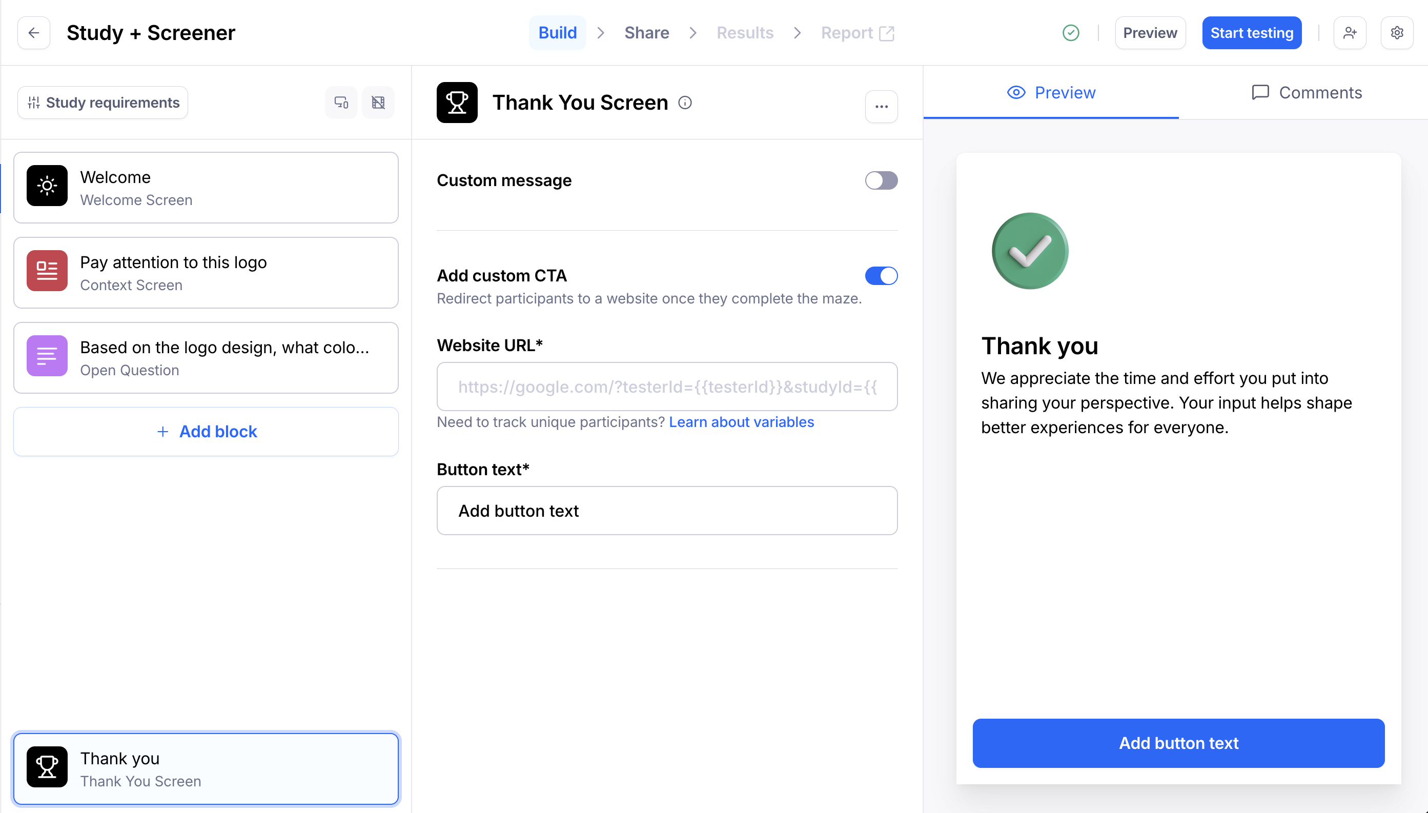 - Open the Thank You screen of your draft maze. This is the final screen that participants will see upon completion. If you’ve added a Screener block, you can also add a redirect to the Rejection screen.