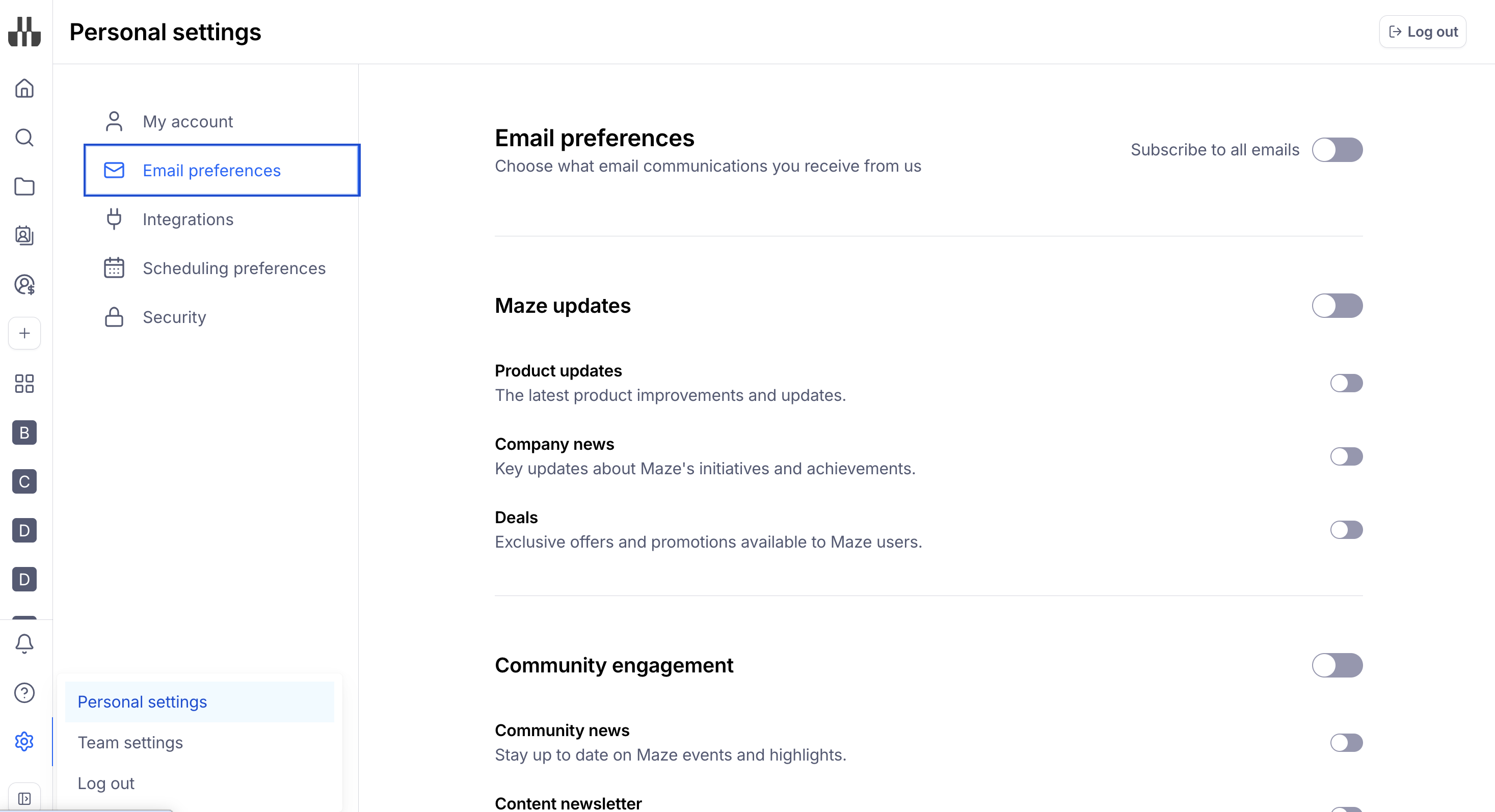 - To choose the emails you want to receive from Maze, toggle on or off each of the categories.