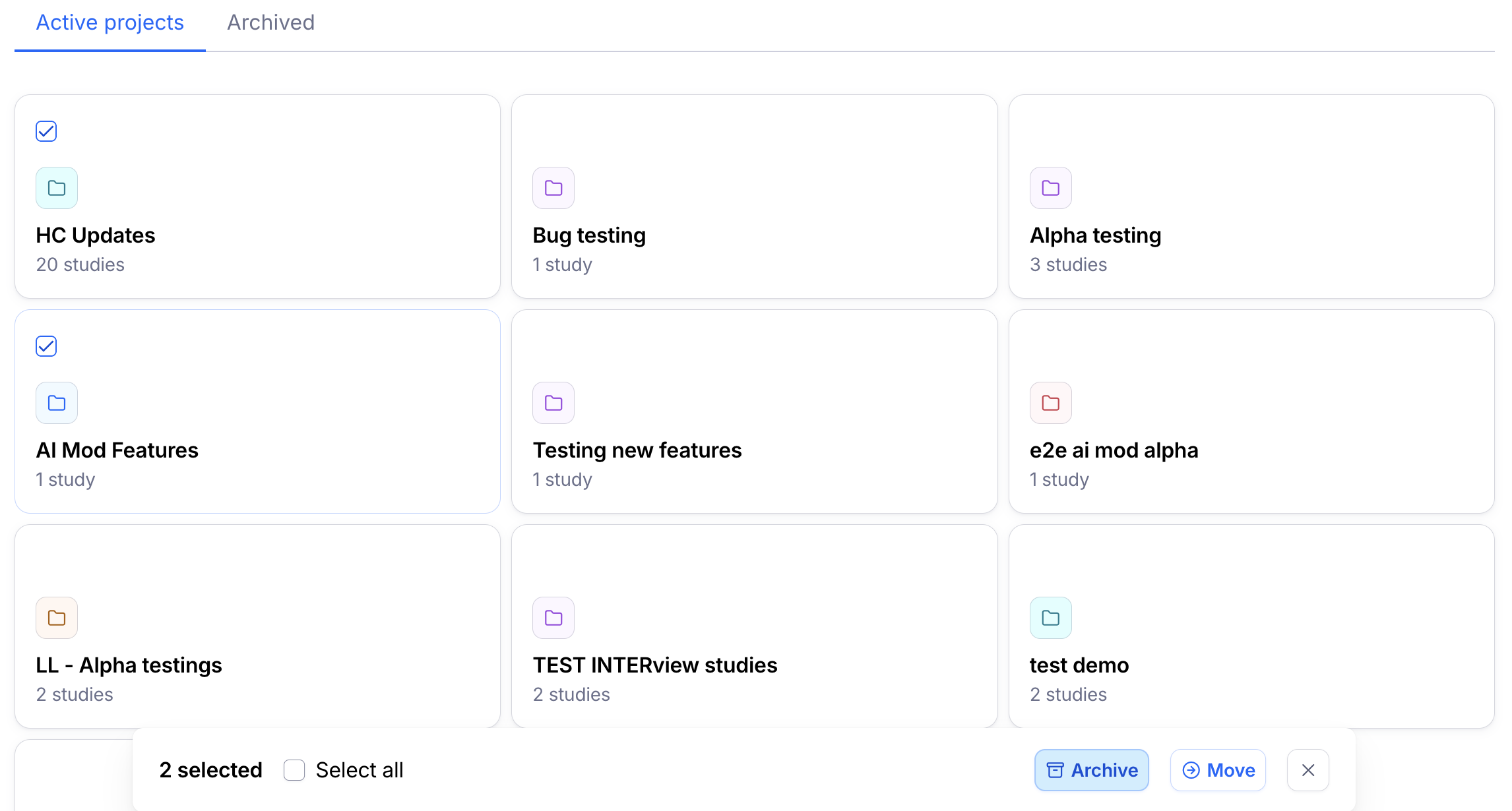 If you’re on the Organization plan, you can also archive projects in bulk in the workspace page by ticking the check box on each of the projects you'd like archived and clicking Archive in the bottom toolbar.