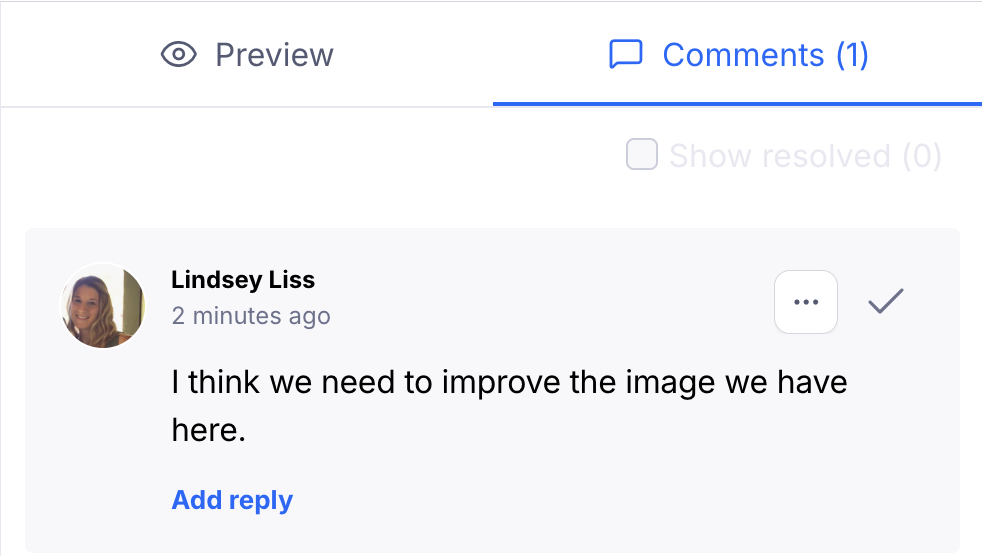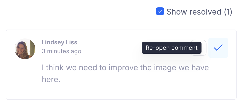 - Click Show resolved to see all resolved comments for that block. The number in parentheses indicates the number of resolved comments.