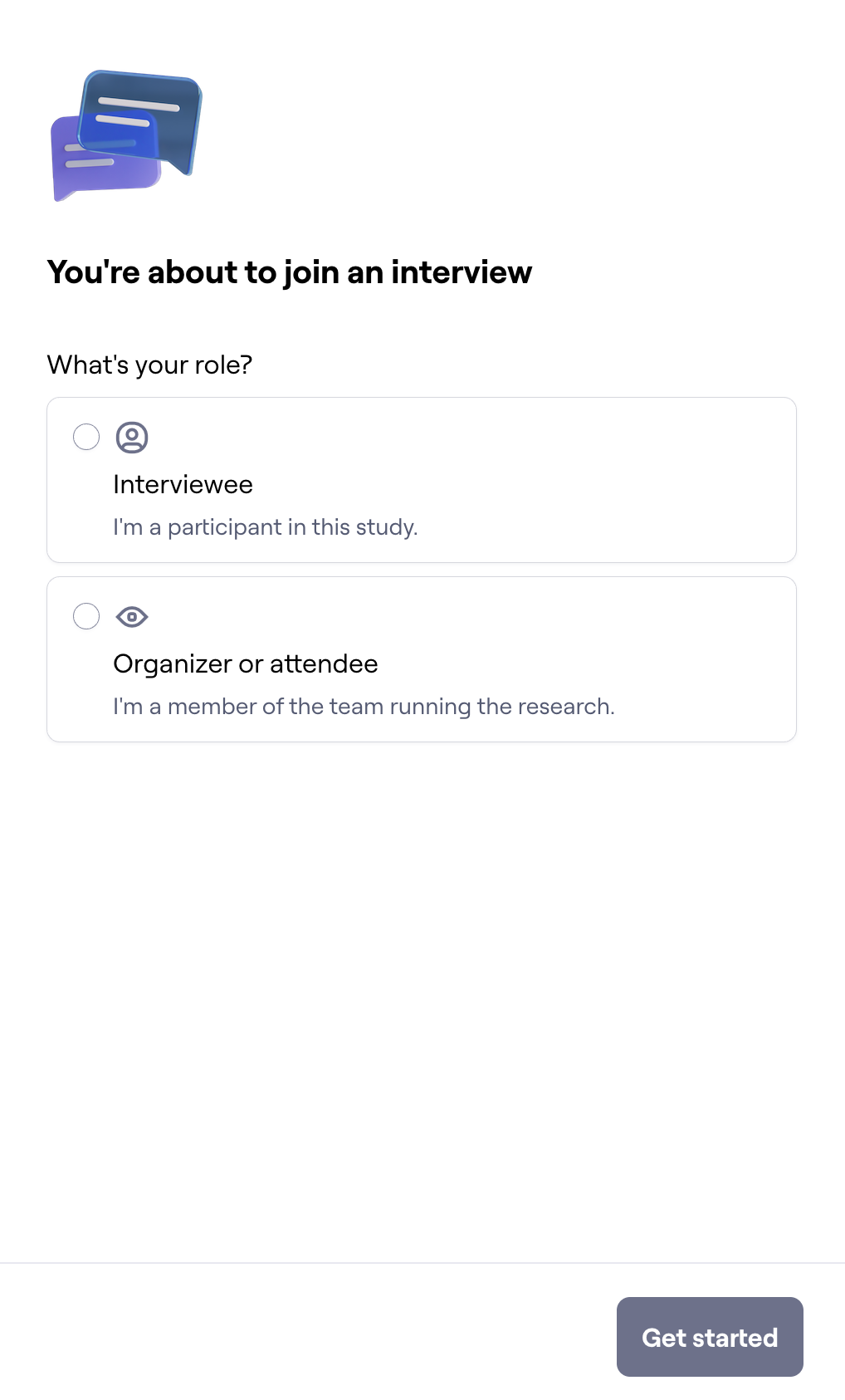 Please note, study conferencing rooms do not have observer links by default before a participant has joined the interview. If observers are needed, researchers will have to share the direct observer link only after the participant has joined the interview.