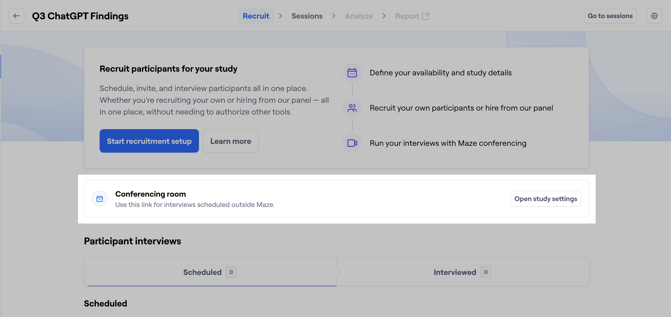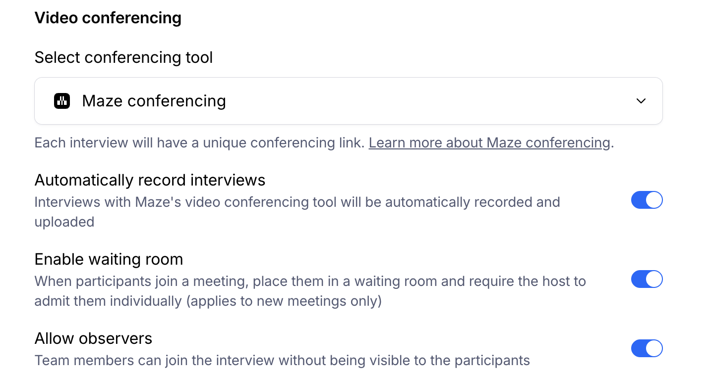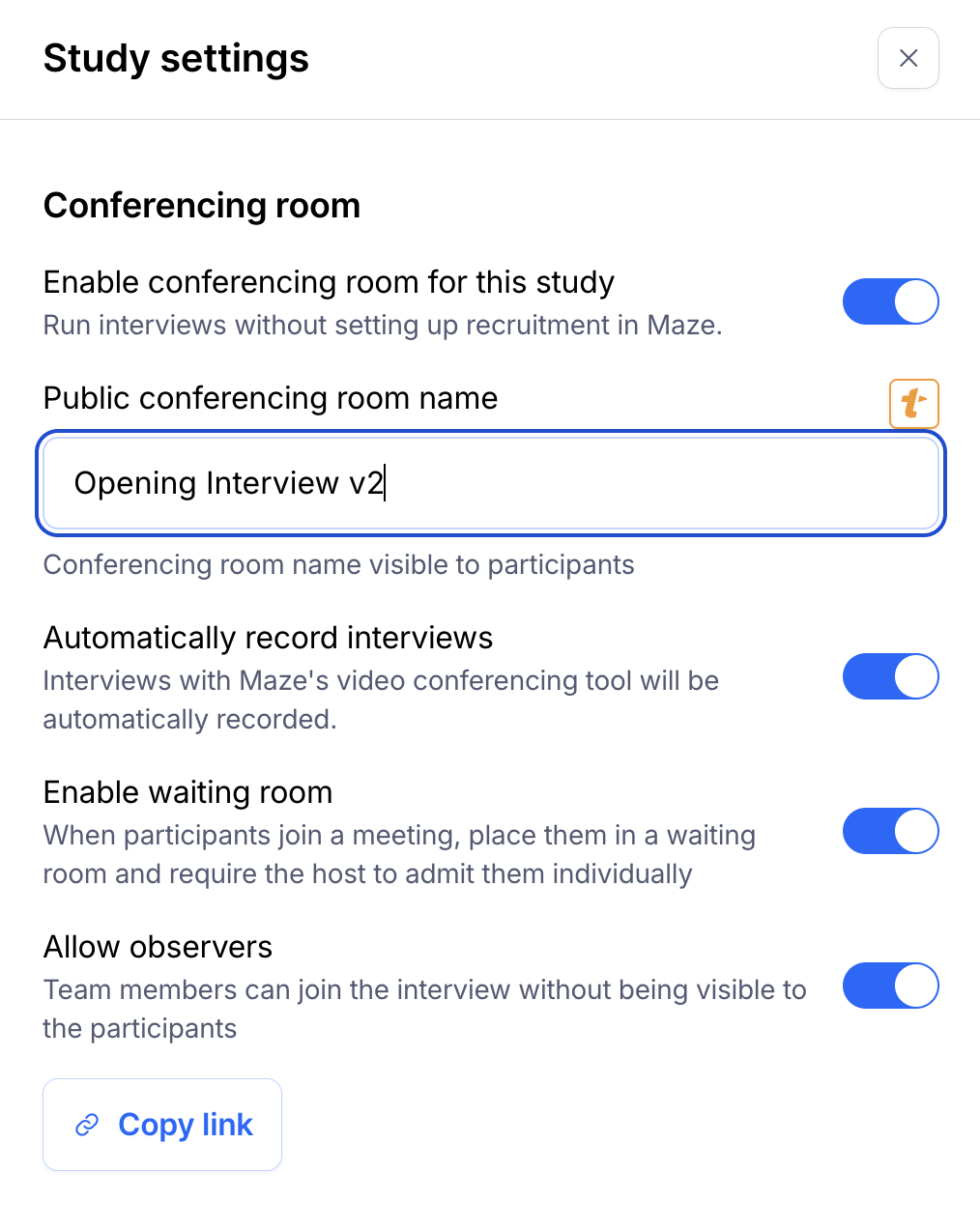 Customers who create an interview study can now generate a study-level conferencing link to share externally when recruiting participants outside of Maze. This is a useful feature that will allow you as the researcher to use Maze for the interview, analysis and reporting even if you are doing your recruitment/scheduling elsewhere.