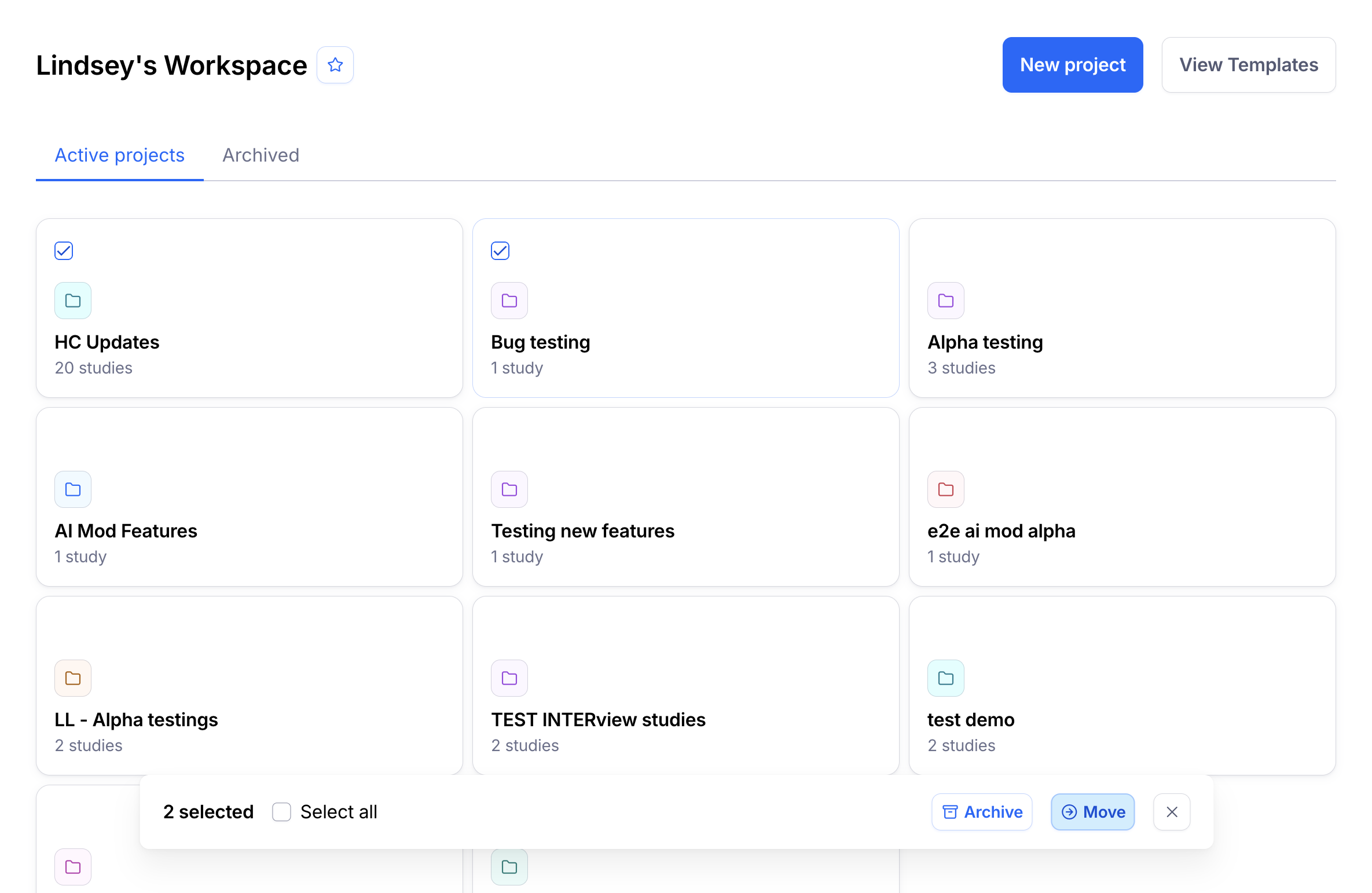 - Click the checkbox on the top left corner of each project card to select the projects you want to move.