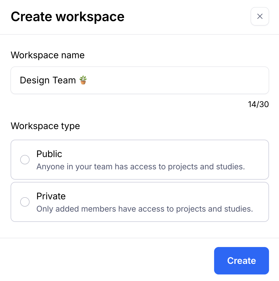- Enter a unique name for your new workspace. The name shouldn’t exceed 30 characters.