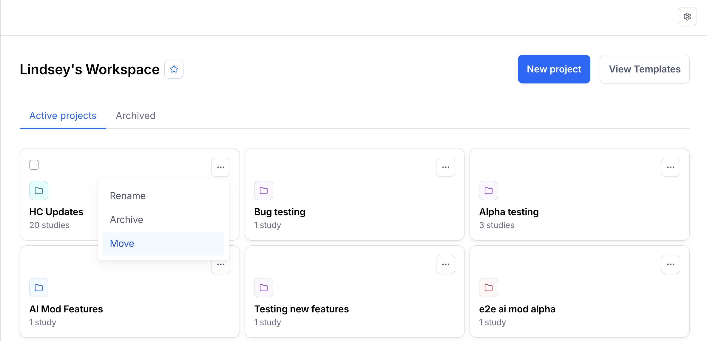 - Hover over the project card and click the ••• (Actions) icon and click Move in the drop-down.