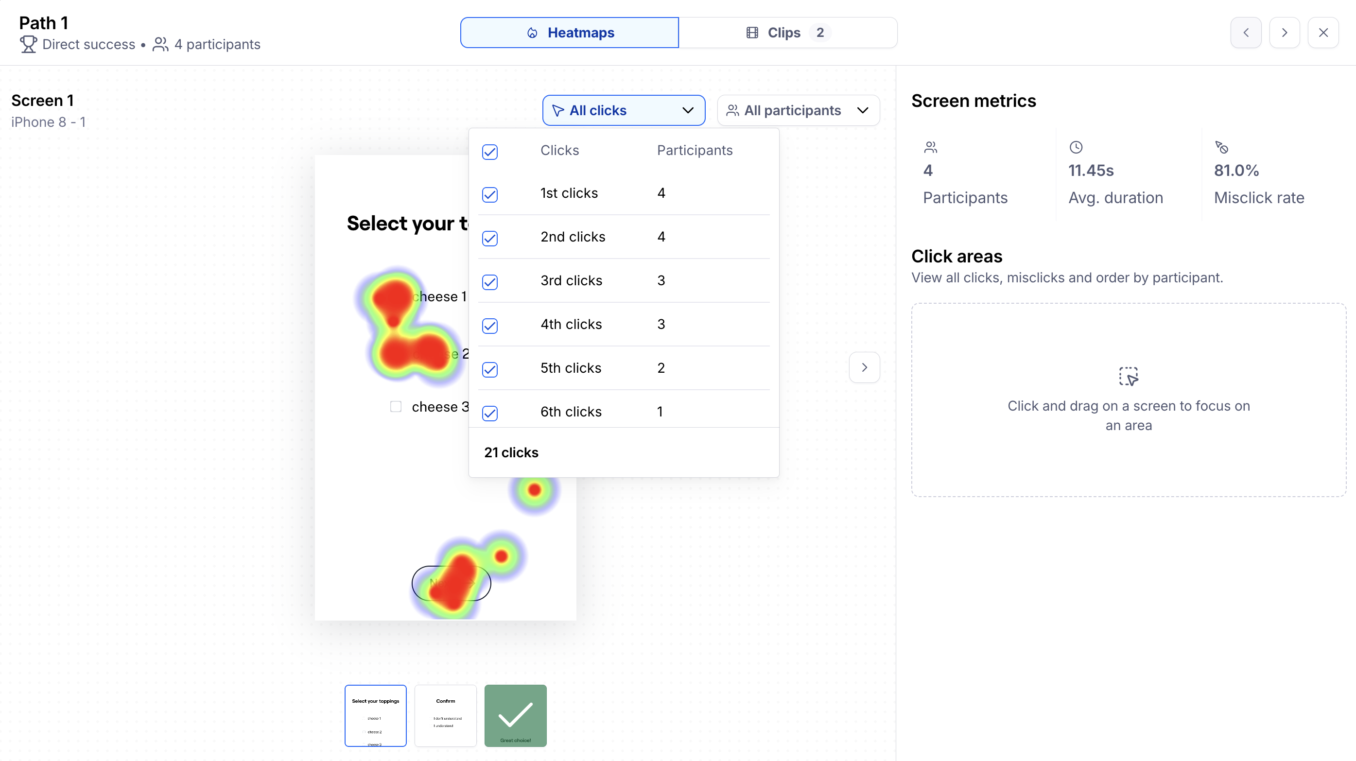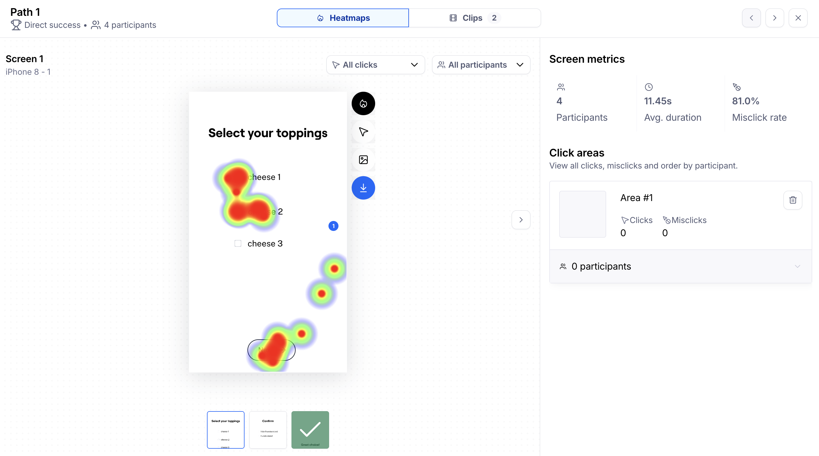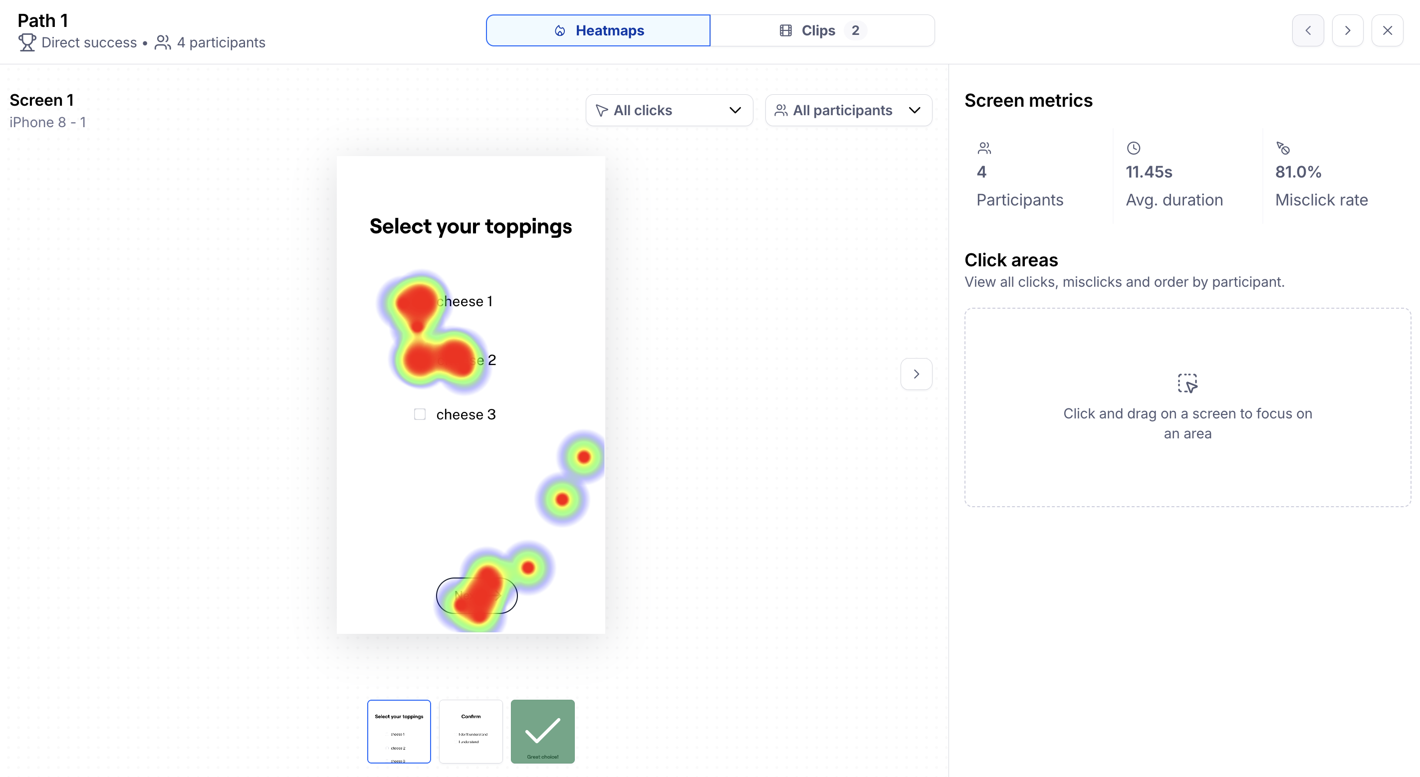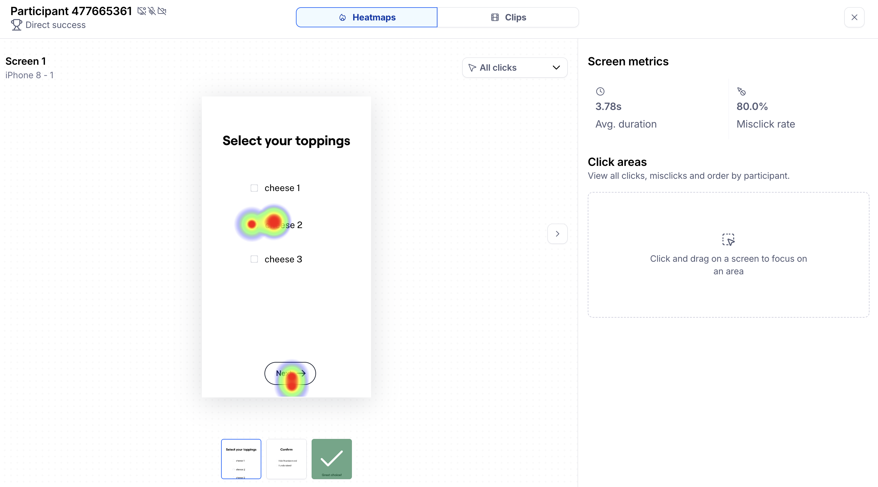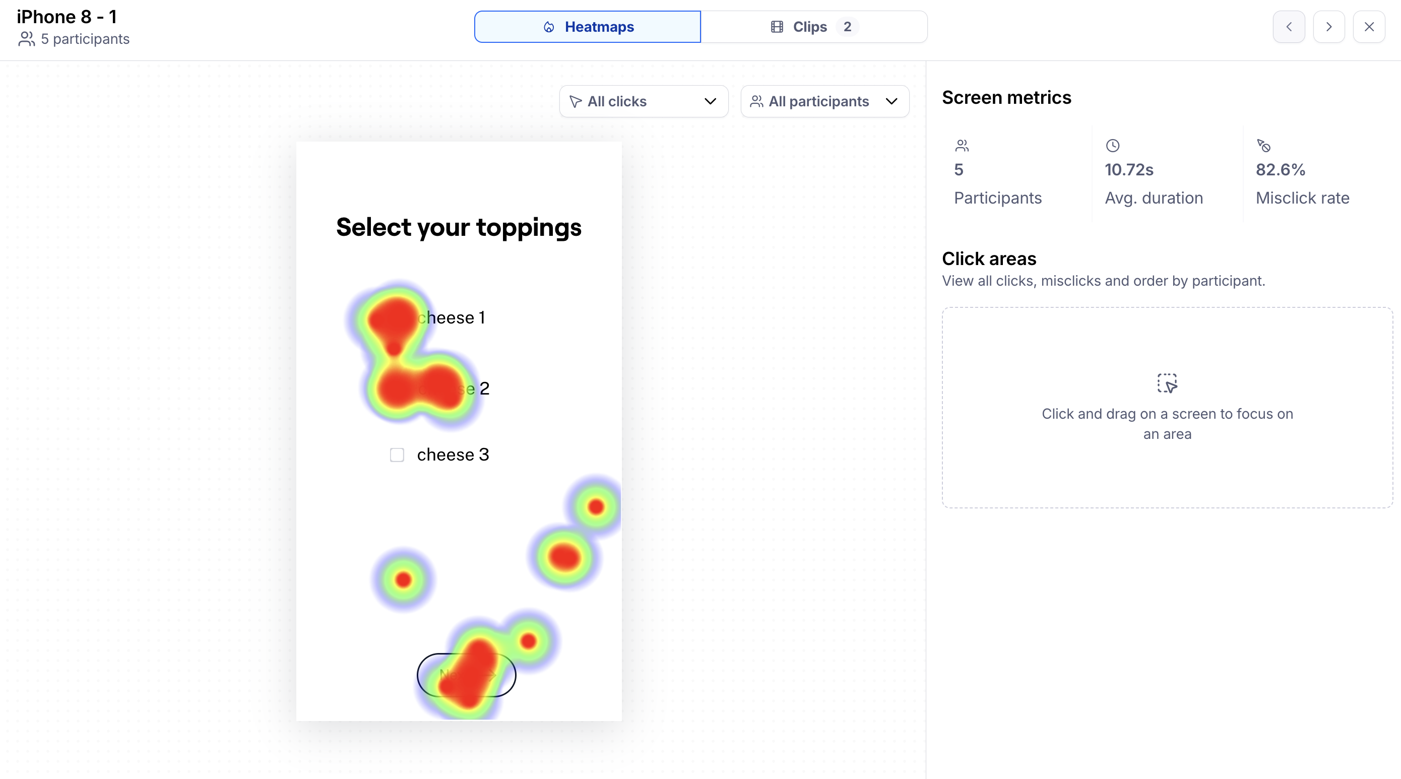 This allows you to take a more granular dive into the behavior of specific participants. For instance, if you notice that a particular participant had a higher than usual time on screen or misclick rate, you can view only their heatmap to understand what might have caused that.