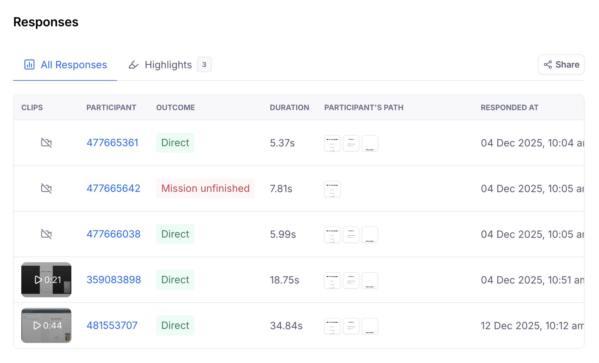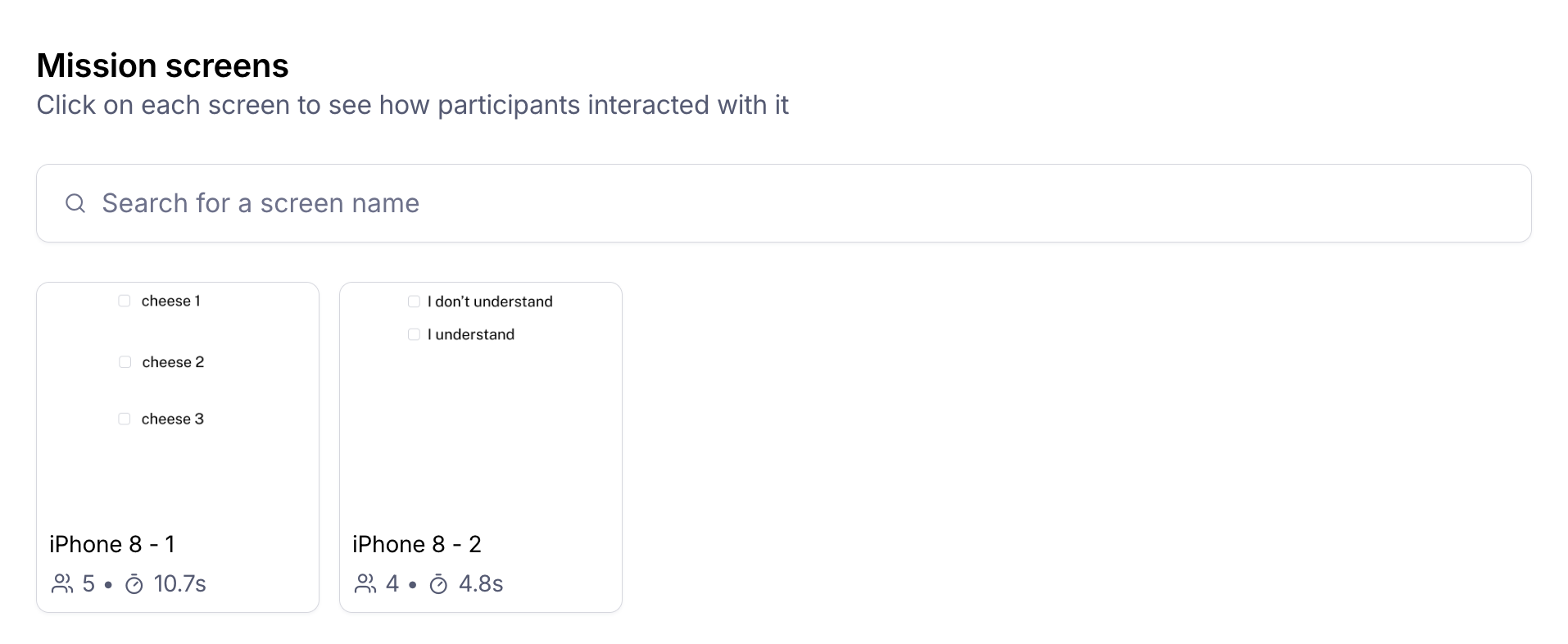- Avg. duration: The average time participants spent on that particular screen. Too much time spent on a screen may indicate that something needs to be improved.