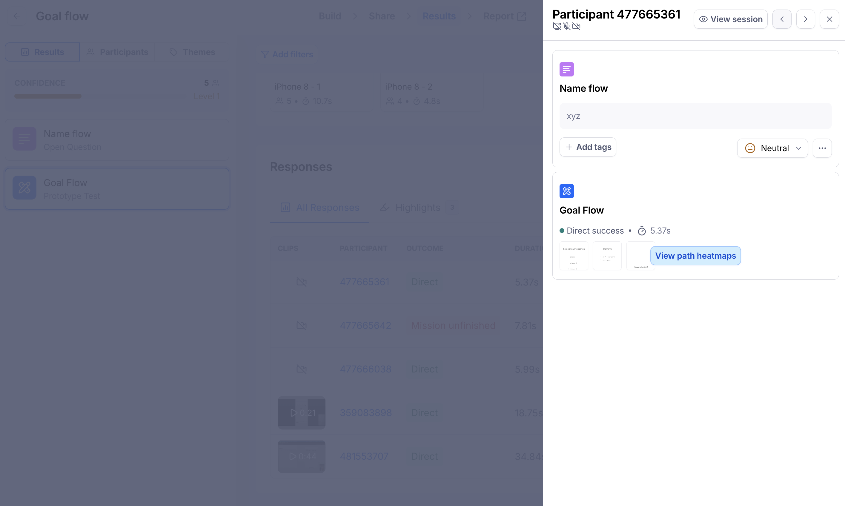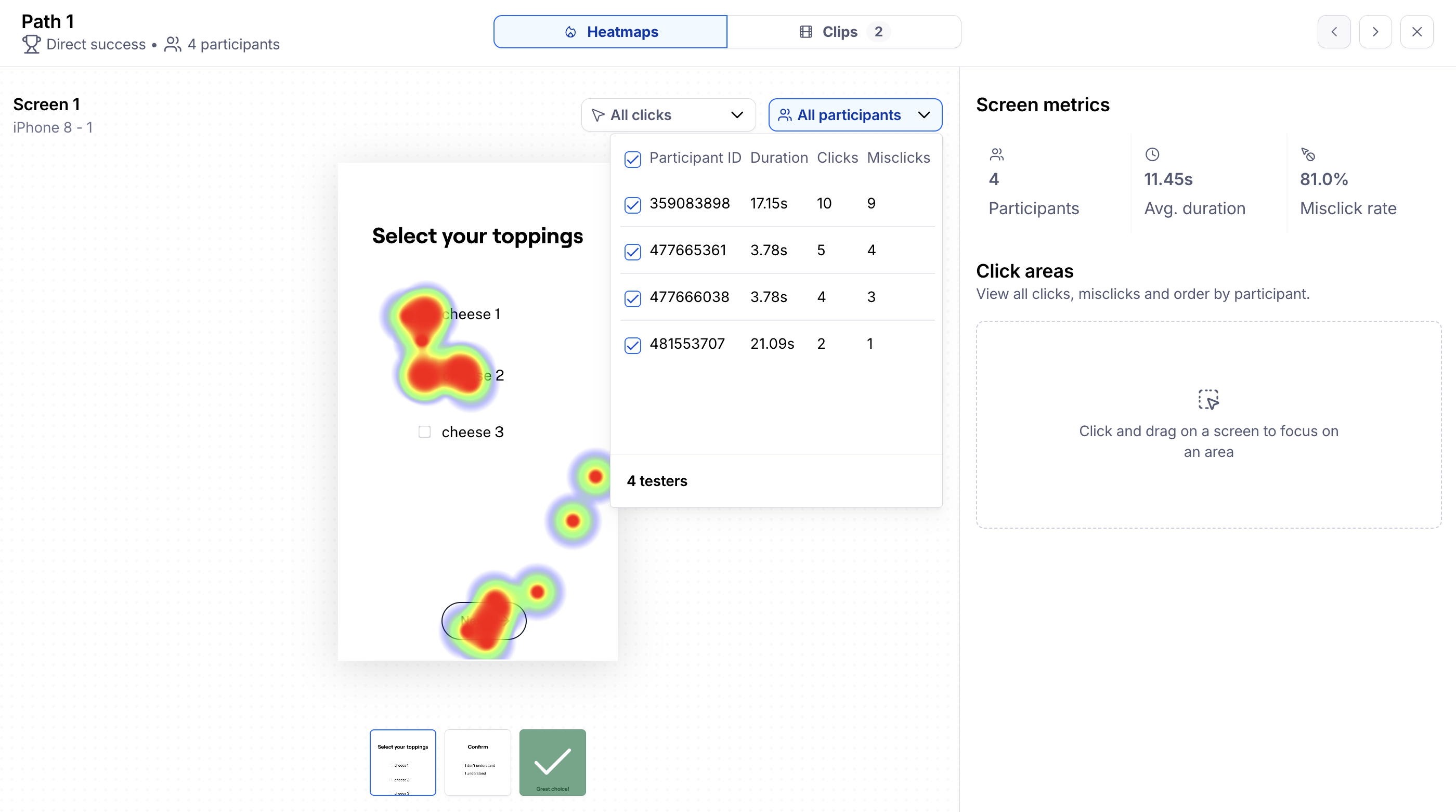 Click the drop-down and toggle between all participants and selected participants. The drop-down will also show you the following details about each participant's session: unique tester ID, time spent on that screen, and number of clicks and misclicks the participant made on the screen.