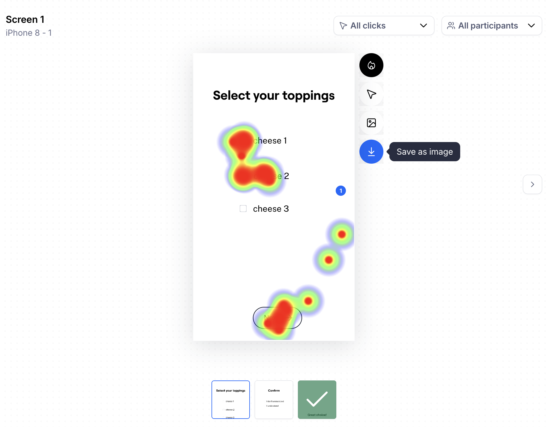 A click heatmap is a visual representation of where your testers clicked on a particular screen. Click heatmaps give you insight into your testers' behavior in your prototype.