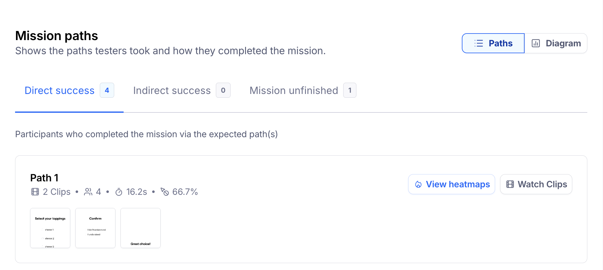 Aggregated path heatmaps display tester clicks based on the mission outcome: direct success, indirect success, or give up/bounce.