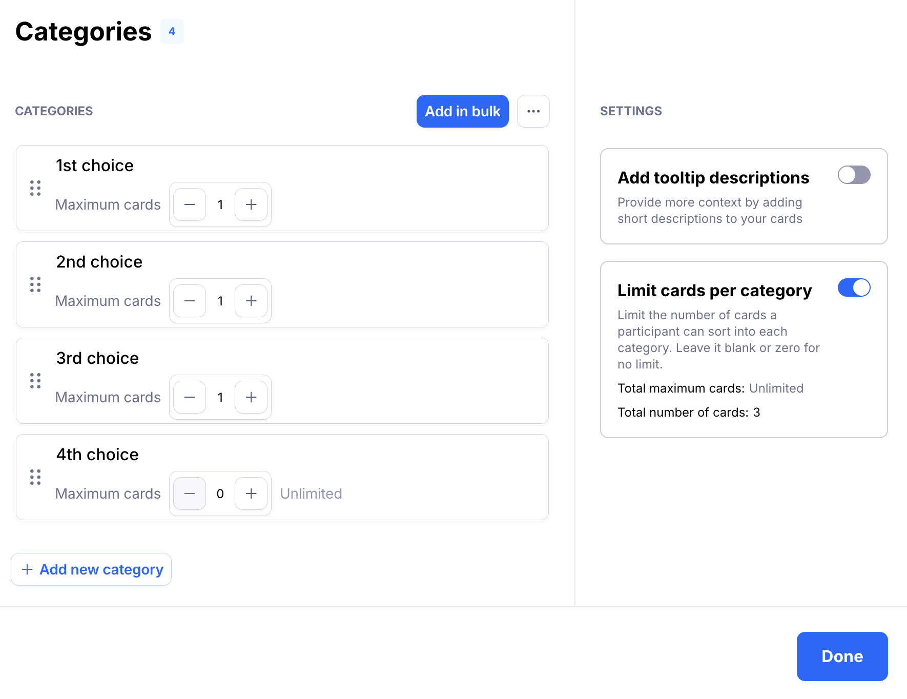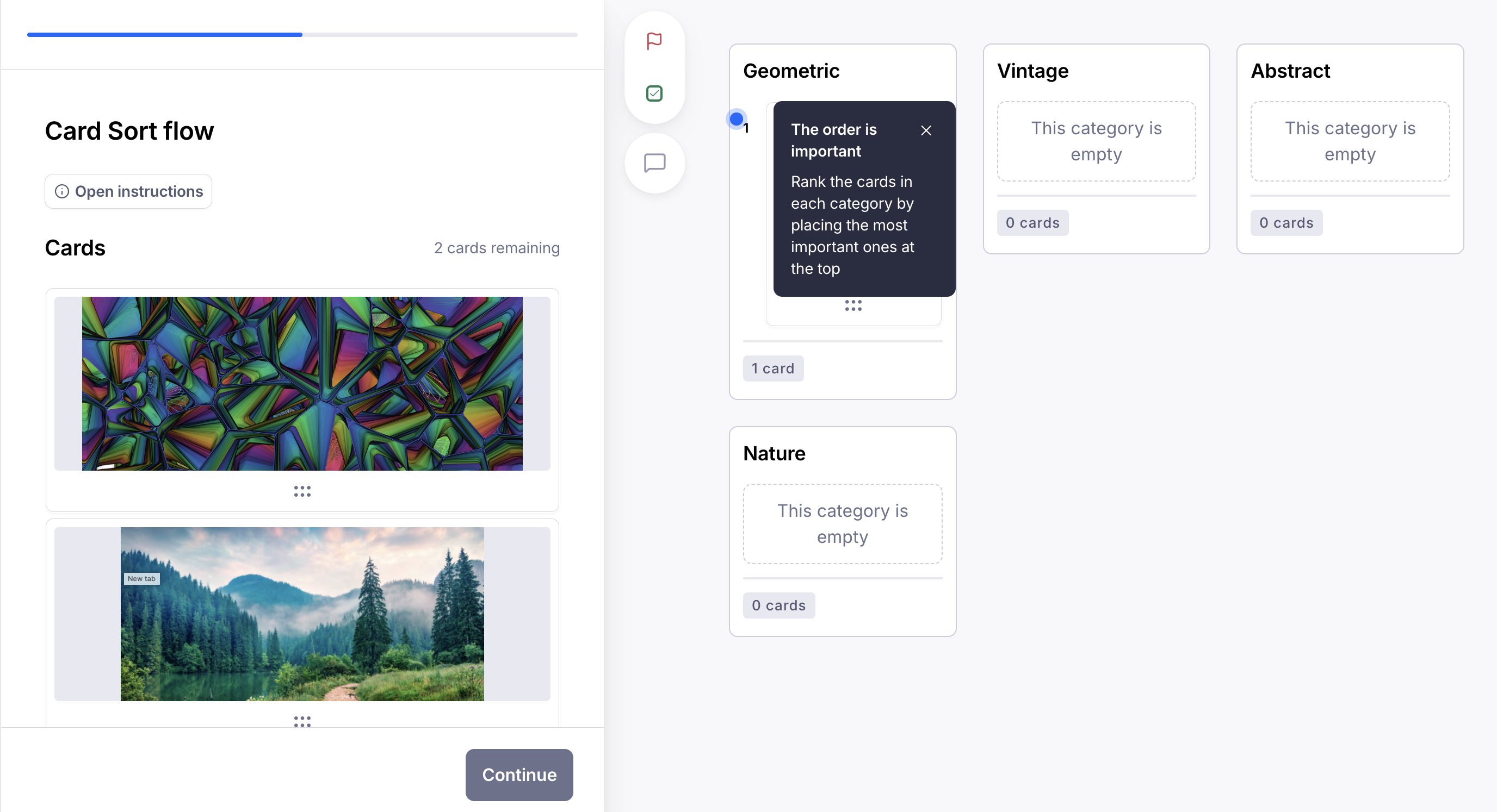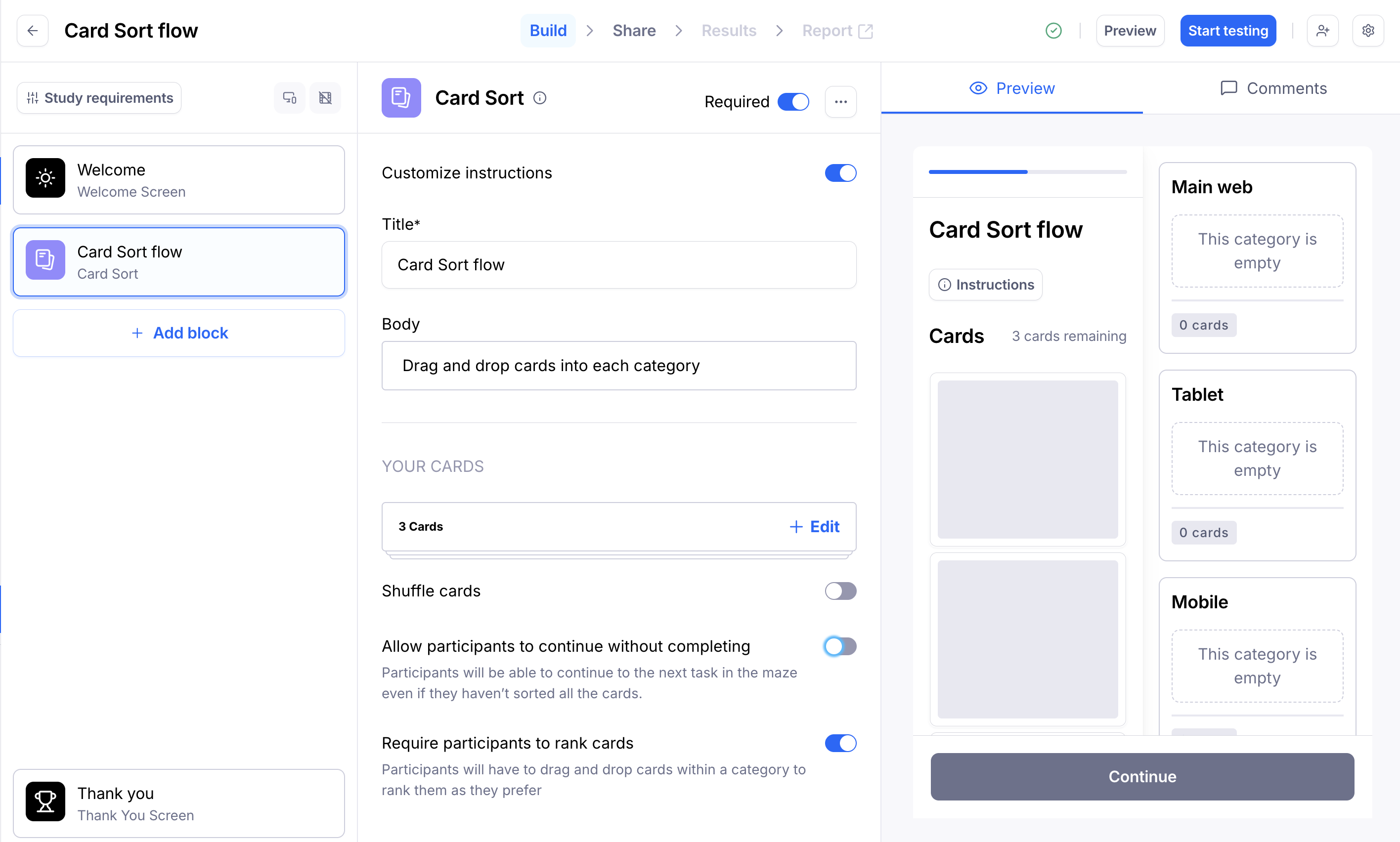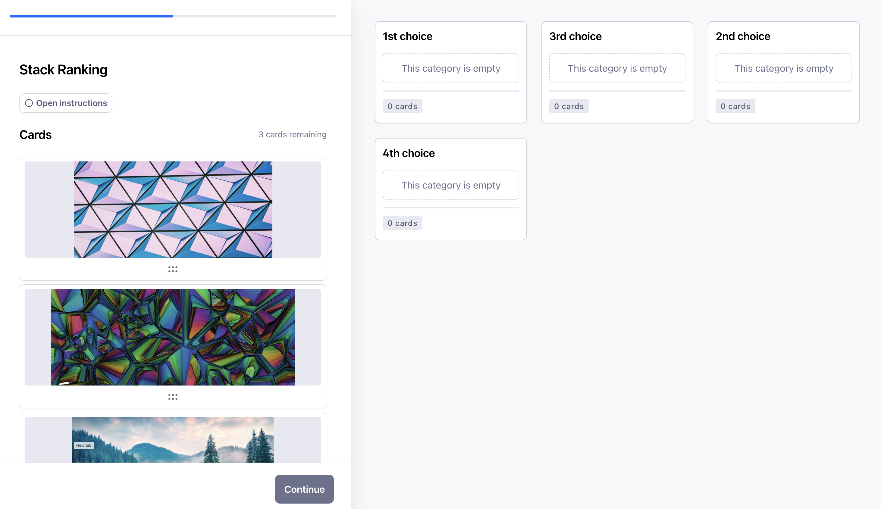 Alternatively, you can prompt testers to rank cards across categories. This approach can be useful if you want testers to pick a few options and exclude the rest.