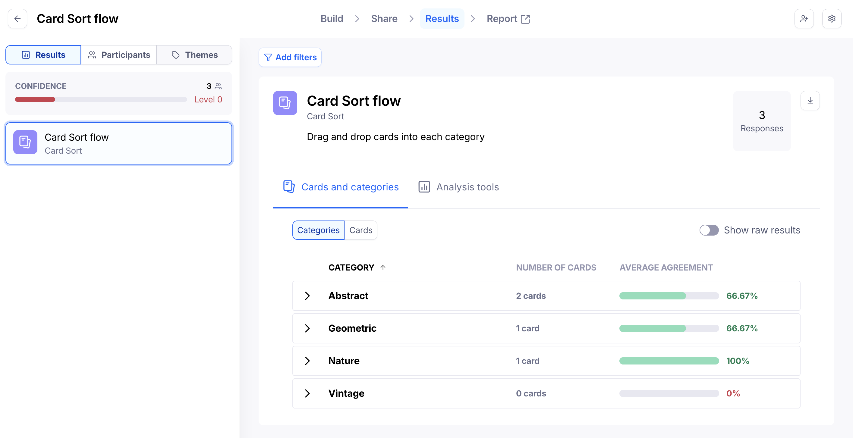 To learn more about how to visualize and understand your results, check out this article: Understanding your card sorting results