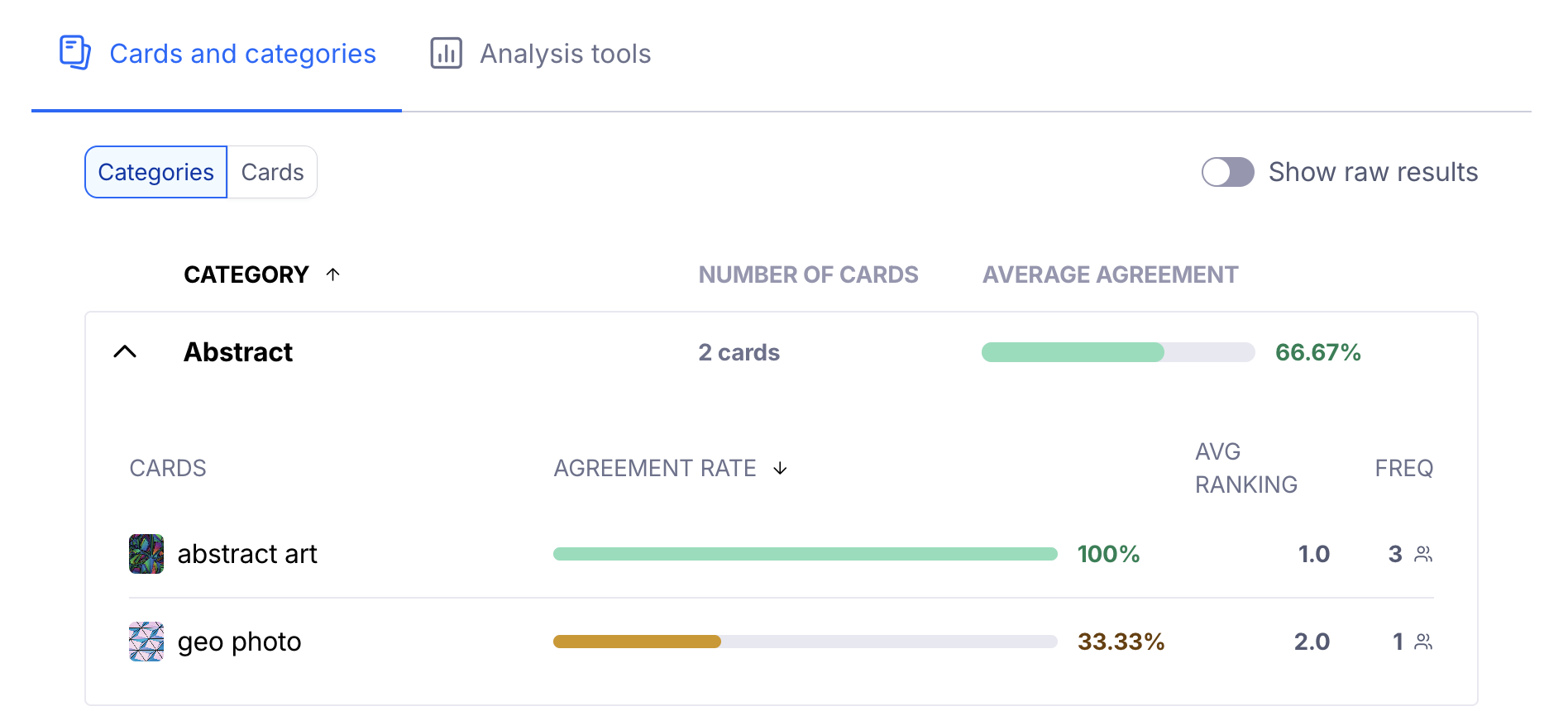 Cards are sorted by the agreement rate by default. Click the AVG RANKING header to sort the cards by their ranking inside that category. Learn more about sorting your results