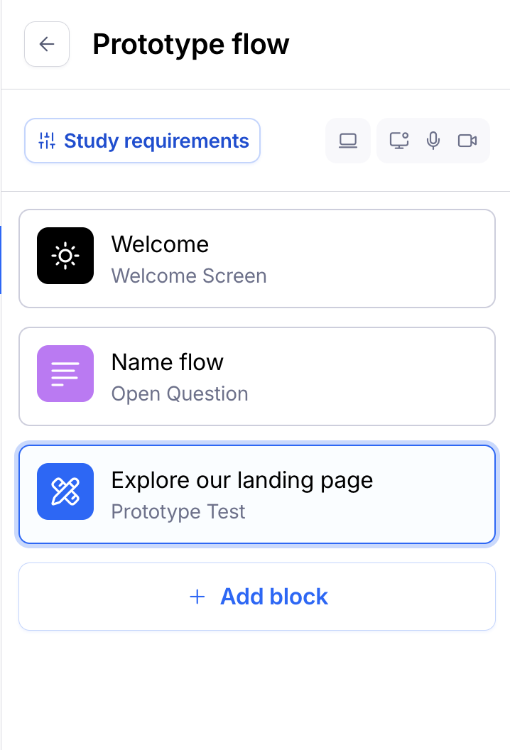 In the blocks list, click Add block, then select a Prototype test block from the drop-down.