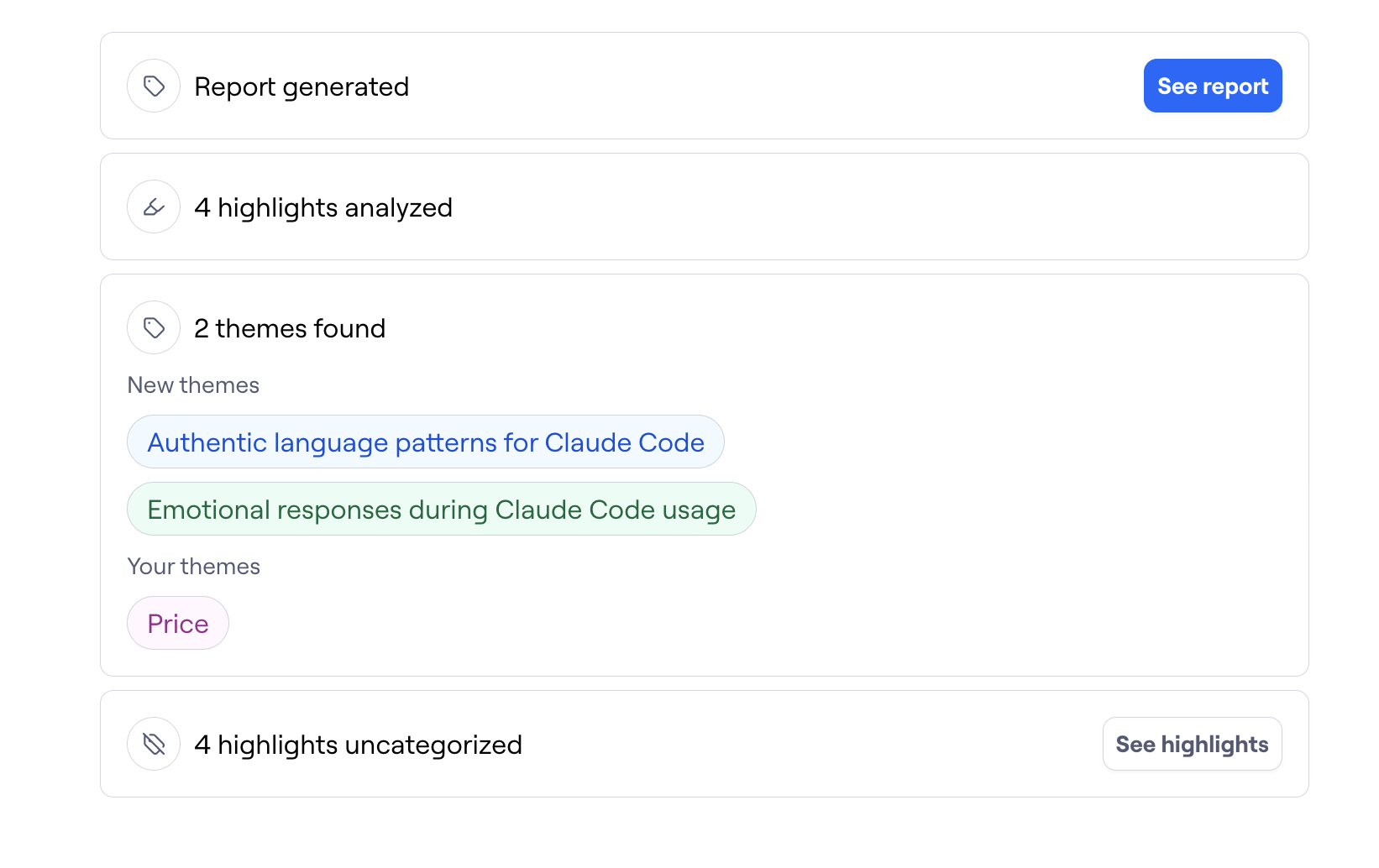 - After the analysis is completed, you'll be presented with a link to the report, the number of highlights analyzed, the themes found along with your defined themes (if applicable) and the highlights that remain uncategorized.