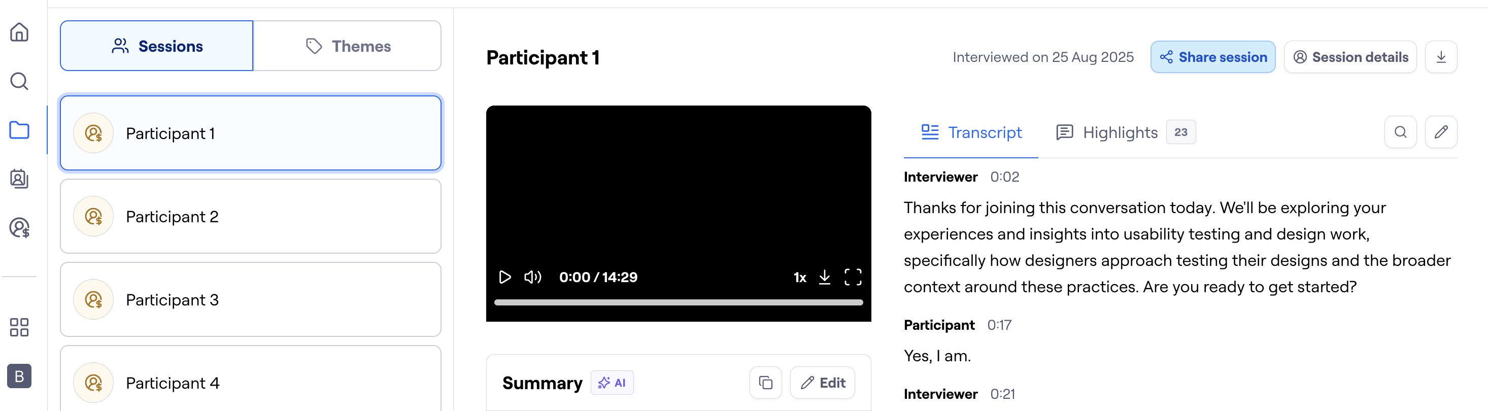 Sessions - Share individual participant interviews by clicking Share session via the Sessions tab