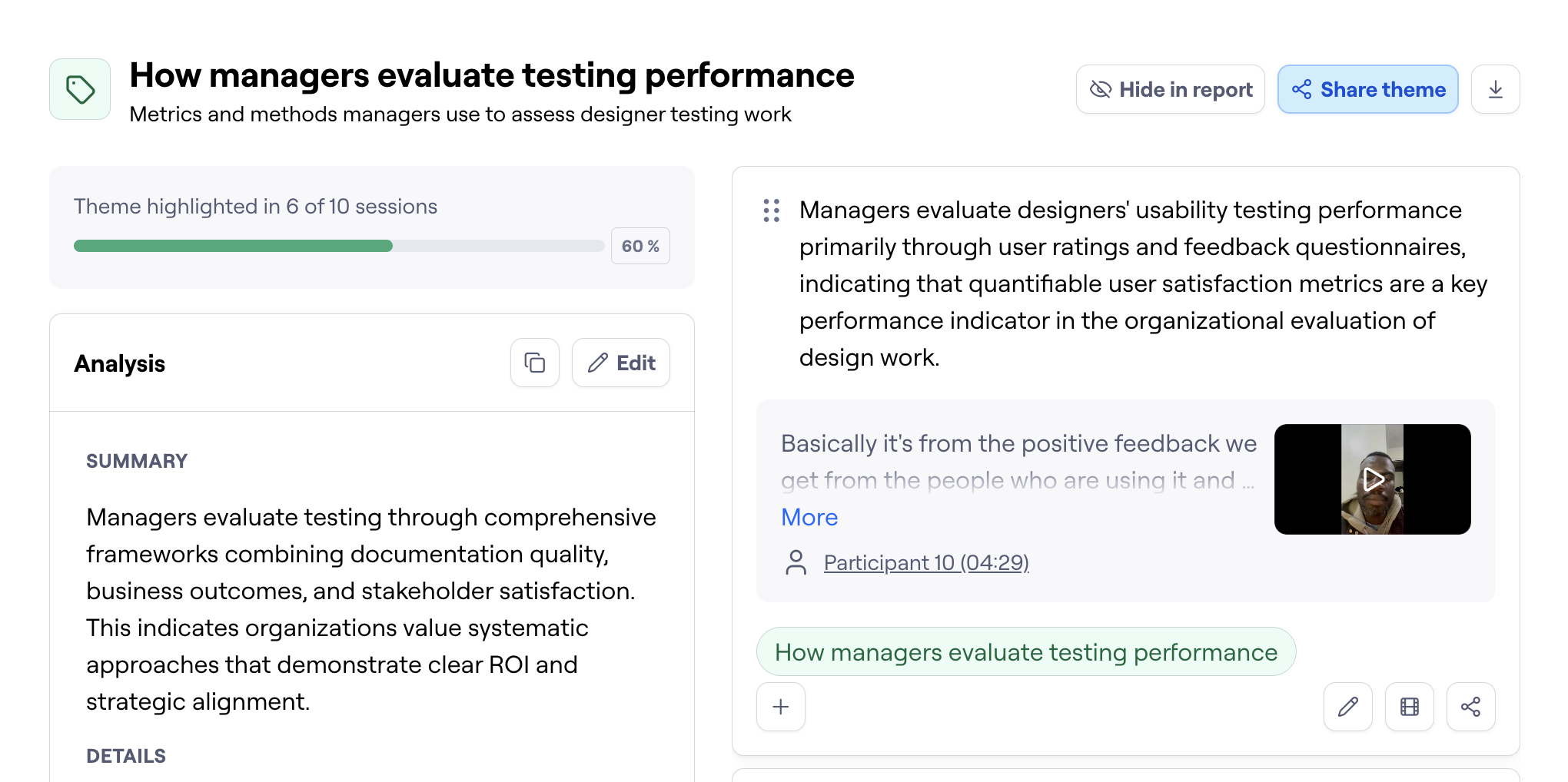 You can add highlights within a theme to a highlight reel to showcase key moments, feedback, and quotes across multiple interviews. Theme highlight reels make it easy to spot patterns within a theme and share insights with your team.