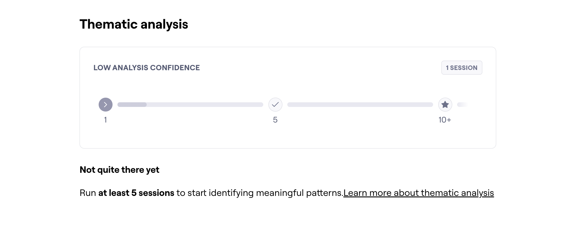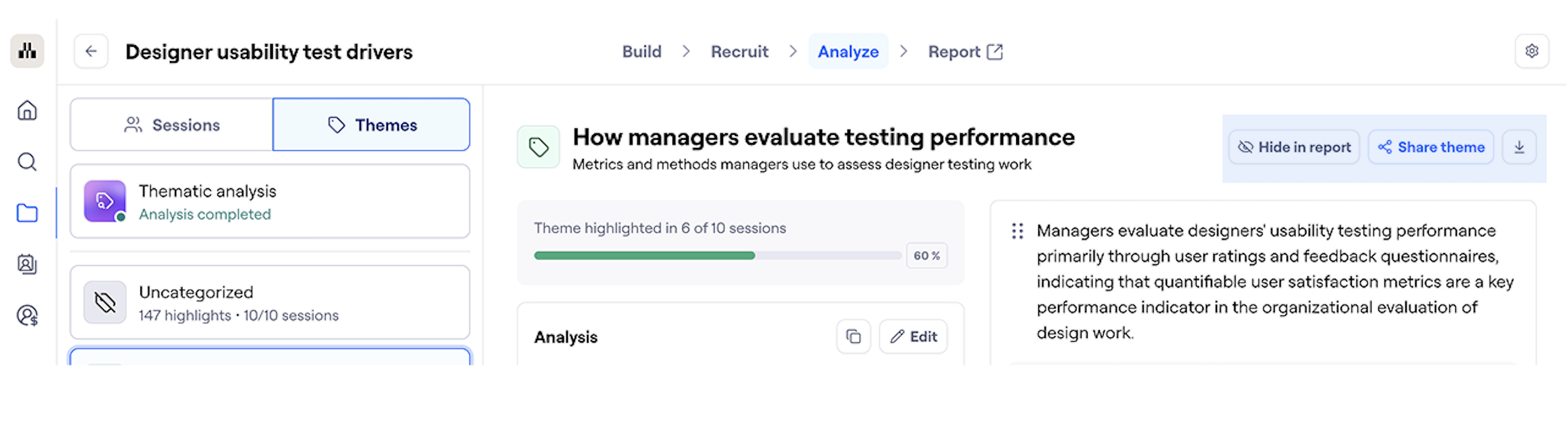 Thematic analysis automatically identifies patterns and insights across all participant sessions within your AI-moderated study, transforming individual participant feedback into comprehensive, actionable themes. This powerful feature analyzes your transcripts to surface key topics, sentiment trends, and findings that help you understand the bigger picture from your research.
