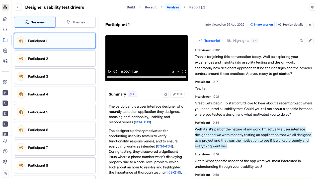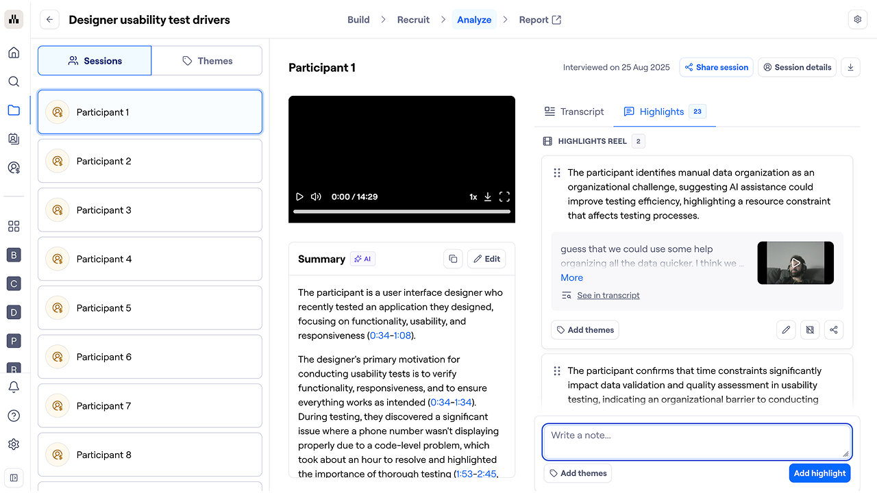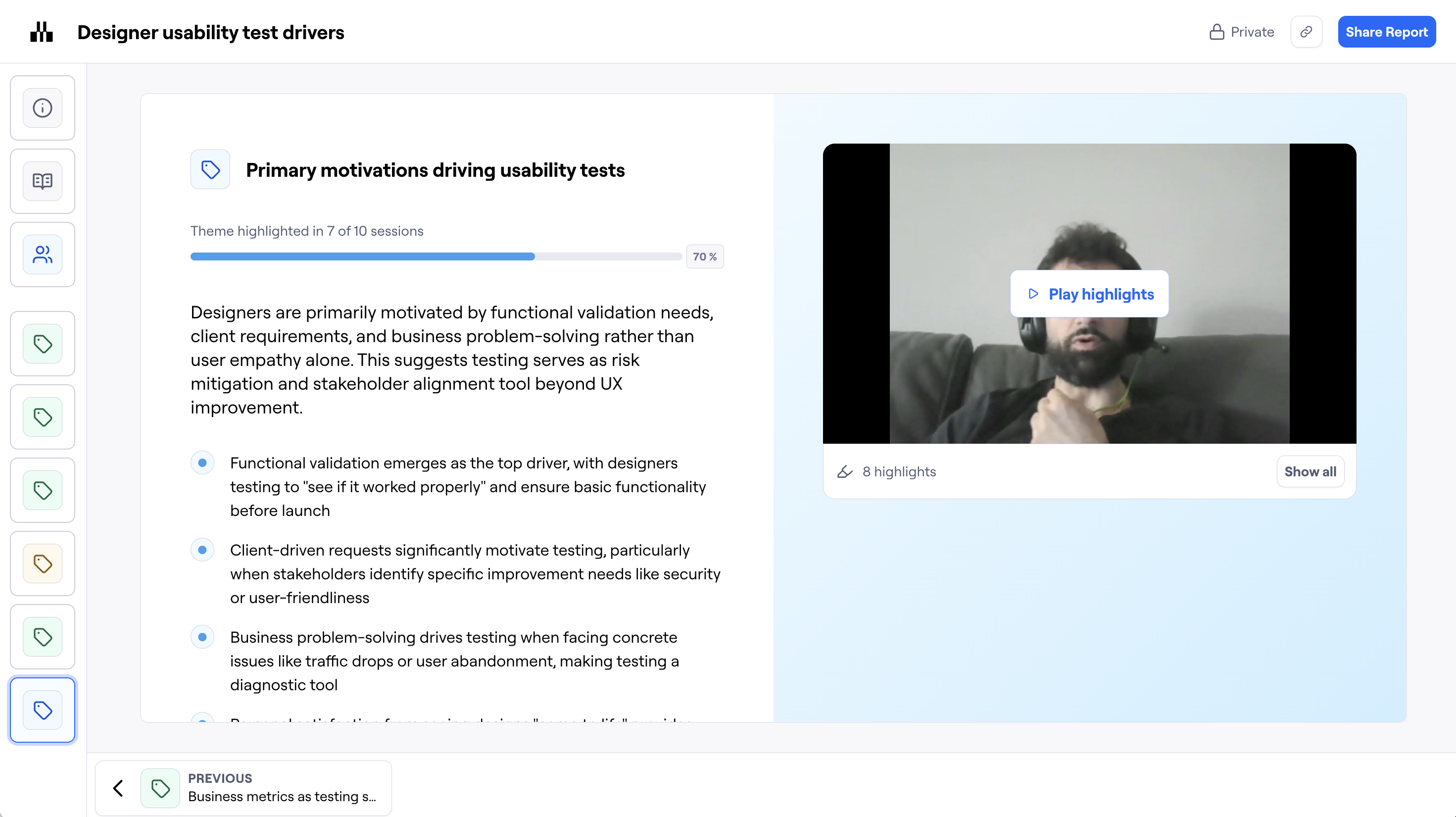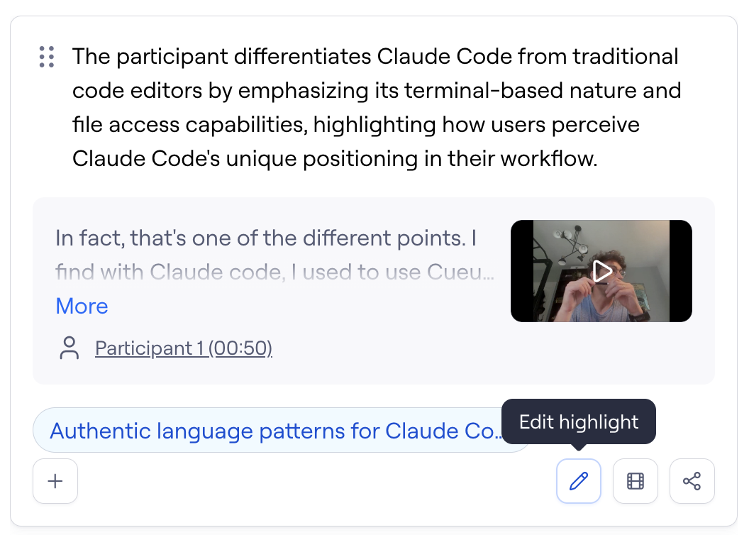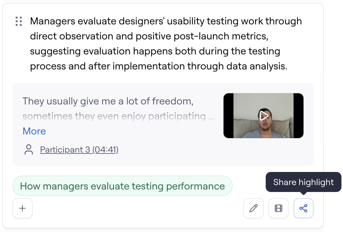 - Highlights - Share particular participant quotes or observations by clicking the Share highlight icon.